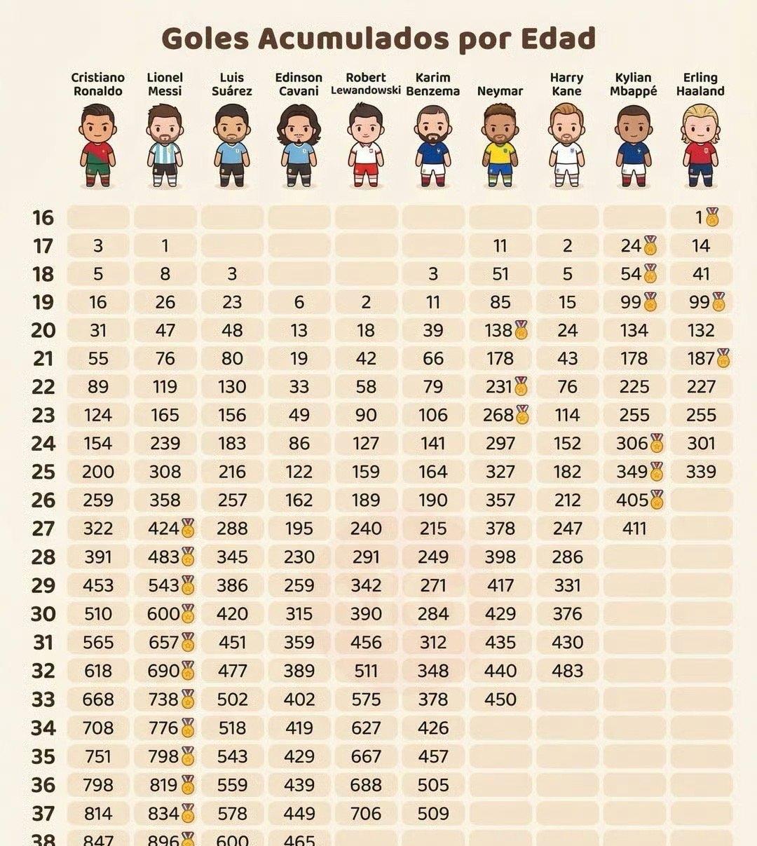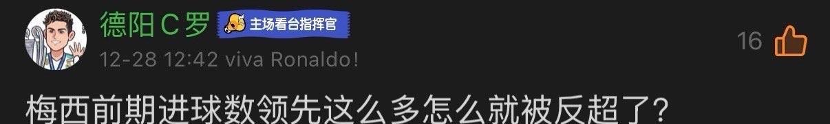 有媒体统计了各大神锋在不同年龄的进球总数。从18岁到26岁,梅西的进球数虽然不是最多,却比C罗多。从27岁到38岁,梅西最多。从39岁到40岁,C罗最多。 C罗粉丝因此亢奋了:梅西前期进球数领先这么多,怎么就被反超了? 这几人里也就C罗年过四十,所以他才有39岁和40岁的进球。梅西今年38岁,就没有这两个年龄的数据。也就是说,靠着大两岁,C罗才在39岁和40岁胜出。 到罗粉嘴里就成了反超。 照俩人的进球效率,39岁和40岁的数据,也会是梅西多于C罗。