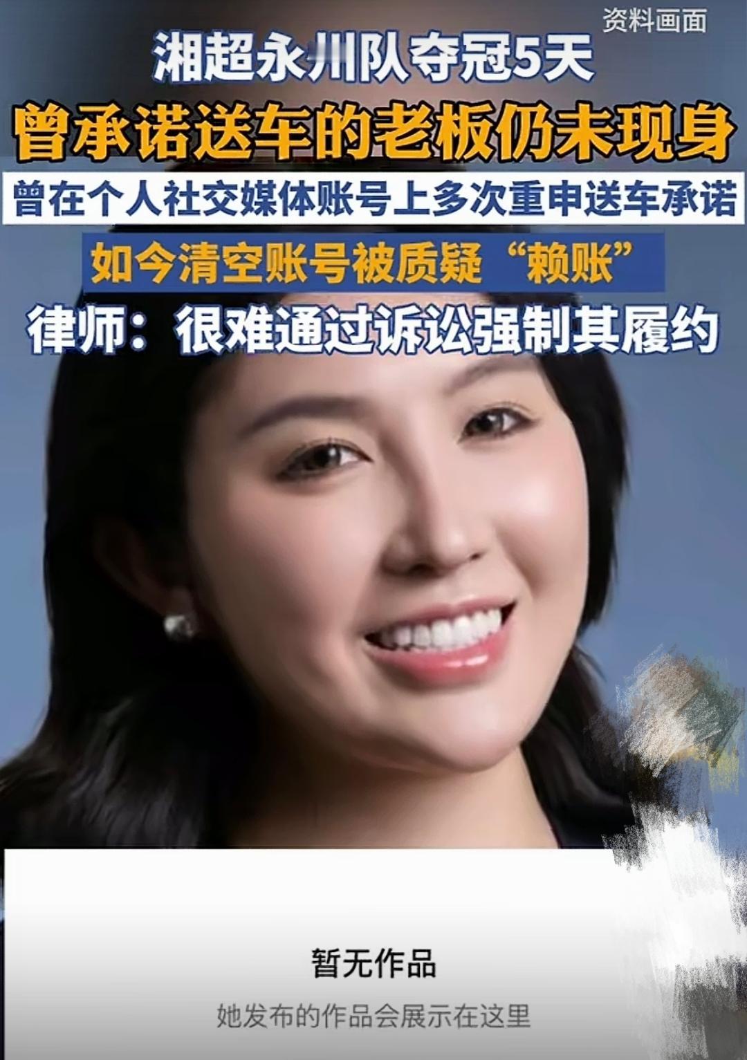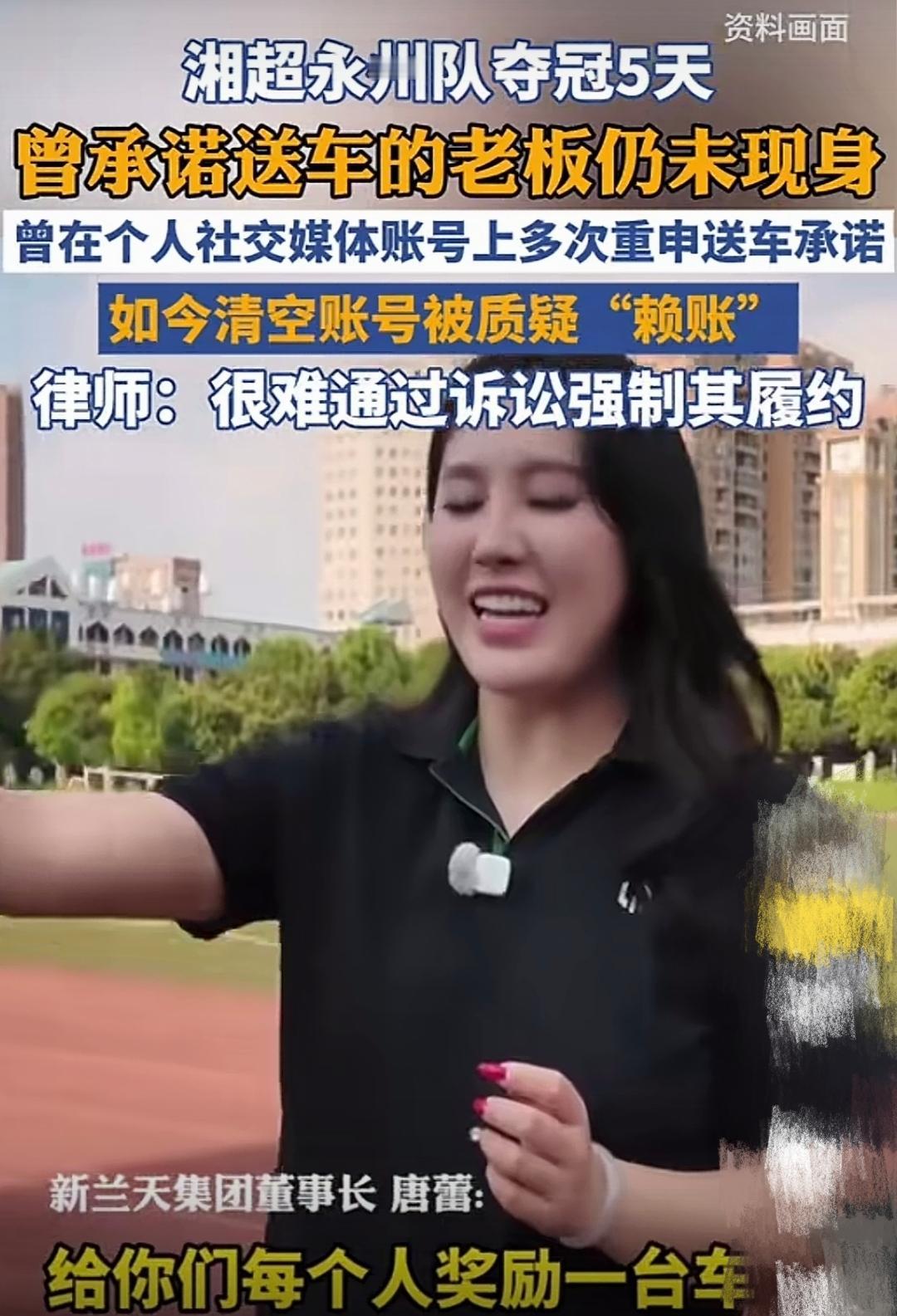 说话不算话,企业的诚信何在? “夺冠就每人送一台车!”这句话曾像一针强心剂,注入到湖南永州队每个球员的心中。 新兰天集团董事长唐蕾赛前多次高调承诺:只要永州队在湘超夺冠,每人奖励一台车。随后网友问其承诺的车是不是电瓶车?她还回应“格局没那么小”。 这句话让网友见识到了一位女企业家的“豪横”。可后来永州队从常规赛一路逆袭,最终捧起了湘超冠军奖杯时,她却莫名消失了。 谁也没想到,永州队夺冠后,唐蕾不仅没有现身履约,她个人社交账号上的视频内容也被清空,只留下网友们满脑子的问号。 那些曾作为承诺证据的视频,企业方称:只是暂时隐藏,而当初说送车或许不算正式承诺。 随后,永州文旅局去联系,得到的回应竟是“正在出差,元旦后协商”。可现在元旦已过,仍没有兑现。 这样的剧本让人感觉好熟悉。流量蹭足后,就开始技术性撤退。也许当初她自己也没想到,永州队真的会夺冠。 球员们也说的很直白,感觉她就是看不起我们,赌我们不会赢。不少网友更是怒批:“一个个董事长,说话不算数和赖账有什么区别,诚信在哪里?” 不得不说,当初她蹭流量时有多高调,现在面对众人的质疑时就有多尴尬。实在太难堪了! 原来,有些人的承诺从一开始就预设了不会兑现的前提。看着机会渺茫,于是装“大个”,说“大话”,结果打了自己的脸。 虽然有律师指出,此类口头赠与承诺可能难以强制履行,但却逃不过公众心中的那杆秤。 当初高调承诺吸足了流量和关注度,如今却想用“清空账号”来回避,殊不知这样的操作会毁掉企业的商誉。 我不禁想问,当那个“暂时隐藏”的账号内容过段时间恢复时,那些被伤害的信任还能复原吗? 对此,大家有什么看法?你认为她会兑现承诺吗?