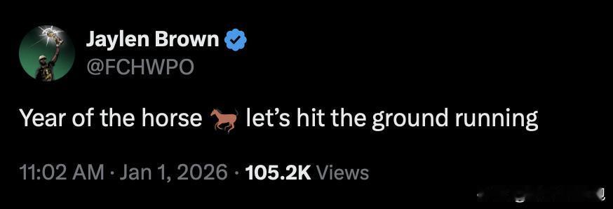 知道一点,但不多[笑哭] 杰伦布朗社媒更新:“今年是马年🐎,让我们即刻策马奔腾!” 好消息,杰伦布朗对中国文华还是有所了解的,不愧是NBA最有内涵的球员。 坏消息,他还不知道阳历和阴历,准确来说马年还没到。