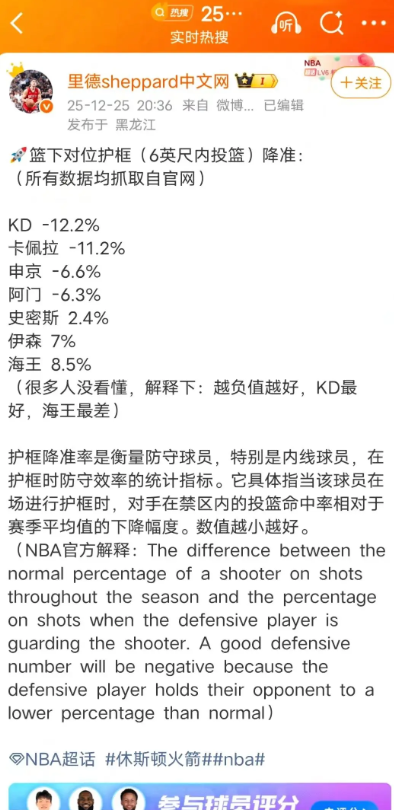 申京本赛季护框表现如何,是否没有防守的刷子? 我们来看这两张图,第一张是截止到12.20的护框次数和降准,可以看到申京的护框次数是联盟第八(比上赛季少了毕竟有三成时间在打pf),降准水平也有中上(比特纳强)。 第二张是截止到12-25,队内横向对比的护框水平,只看降准。可以看到申京护框降准只是显著低于阿杜和卡片,跟阿门差不多,比伊森,史密斯和海王好得多。 所以综合起来有一个大结论:申京护框不差,至少联盟中上水准。 申京是火箭护框次数最多的球员,联盟也在前十(上赛季好像是前三)意味着他的防守积极性绝对没问题,甭管能不能盖到肯定会去防。 另外就是他打的最后几场比赛护框表现还要好于赛季平均不少。 海王护框实际上很不咋地,又慢又跳不起来,所以不要印象流,他的作用在进攻端。 结合防守降准数据(联盟前三)kd防守端绝对被低估了。 卡佩拉护框很强篮板也好,应该是进攻端比较拖后腿导致不能多用。 最后附上图三,上赛季的护框次数和效率图,申京明确是第一梯队的护框次数和中等偏上的降准水平。