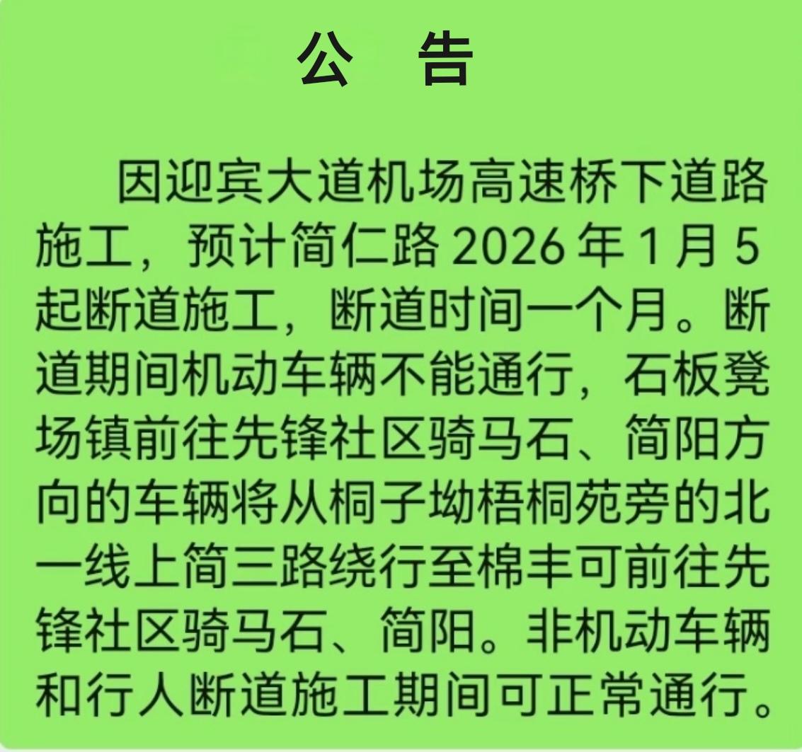 简阳迎宾大道施工,简仁路断道施工公告!因迎宾大道机场高速桥下道路施工,预计简仁路2026年1月5起断道施工,断道时间一个月。断道期间机动车辆不能通行,石板凳场镇前往先锋社区骑马石,简阳方向的车辆将从桐子坳梧桐苑旁的北一线上简三路绕行至棉丰可前往先锋社区骑马石,简阳。非机动车辆和行人断道施工期间可正常通行。