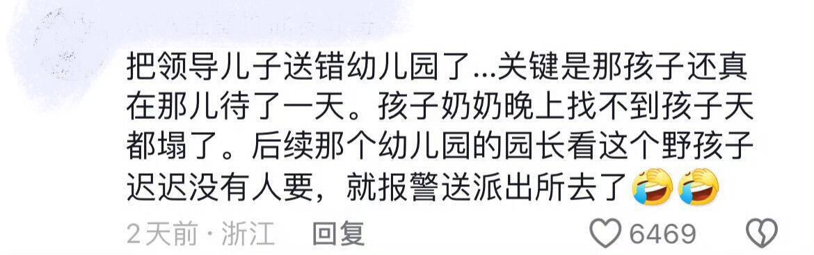 把领导儿子送错幼儿园了...关键是那孩子还真在那儿待了一天。孩子奶奶晚上找不到孩子天都塌了。后续那个幼儿园的园长看这个野孩子迟迟没有人要,就报警送派出所去了