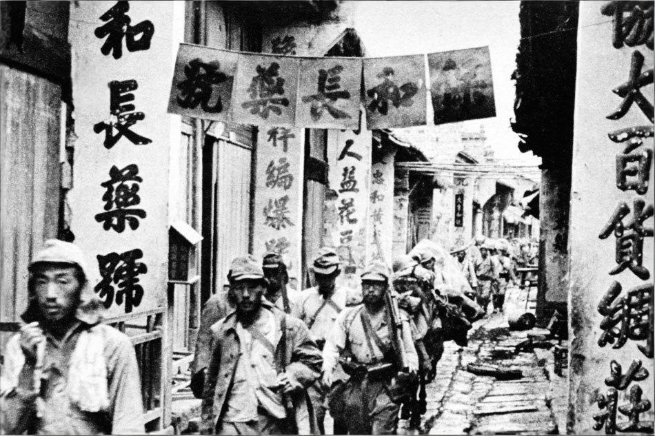 1941年9月23日,第二次长沙会战期间,侵华日军步兵第45联队进入长沙市内长乐街。 照片中,一列日军士兵全副武装,沿狭窄的石板街巷前进,队伍警戒严密。街道两侧为典型的我国南方民居建筑,店铺门柱上挂满中文招牌和横幅。 长沙会战共发生四次,长乐街因地处市区北部门户,在每次会战中均具战略意义,常为日军渗透路线或中国守军阻击点。