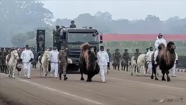 印度阅兵玩出新花样,让人“叹为观止”! 印度以前组织阅兵以摩托车叠罗汉为招牌,各种特技表演,场面往往让人忍俊不禁;而这次又出新招了:首次派出动物方队。 领头的是2只骆驼,跟着就是4匹山地矮种马、4只猛禽、10本地犬只和6只现役军犬。 为彰显“印度制造”,这些动物可都是印度本地产,不像印度军事装备那样“万国造”,这也算是响应了印度的“自力更生”。 当别人以阅兵来展示高科技装备,扬军威国威时,印度可不是这么想,他们的阅兵贵在有创意,出新招。 阅兵动物方队,世界仅此一例。