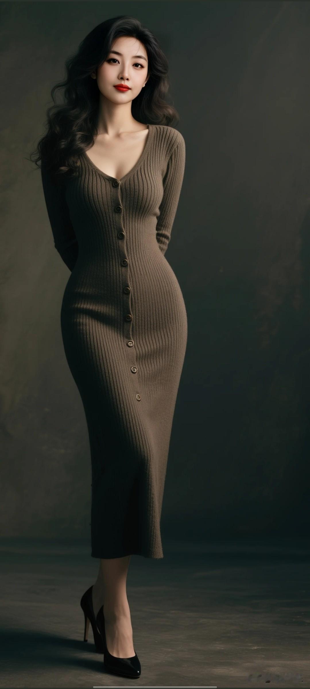 晒图笔记大赛摄影作品,高清,暗光,亚裔美女,葫芦型身材曼妙,丰满。波浪发,针织圆领开襟长裙,精致排扣。高跟鞋