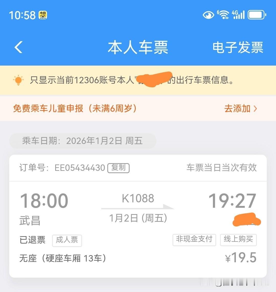 已买好今18点回家火车票,与儿子在汉办完事,他哀求说“开车送你回家吧!” “啊?我已买好下午6点回家火车票,何必呢?来回光油费几百,哪划得来?” “送送吧!我想…,”感觉到几乎乞求口气和眼光,顿时猛然醒悟,他快一年没见到他妈,也许硬想回去见见娘呢! “…,你?硬是想回一趟家?” 儿子点头示意,“那好吧!我把下午火车票退掉,能节约就节约几个。” 一会儿,退票时因离开车时间太近,结果扣除手续费4元,只退款15.5元。 也是!哪能把账算得那清呢?今还是元旦假期嘞!权且当过节费送就送吧!