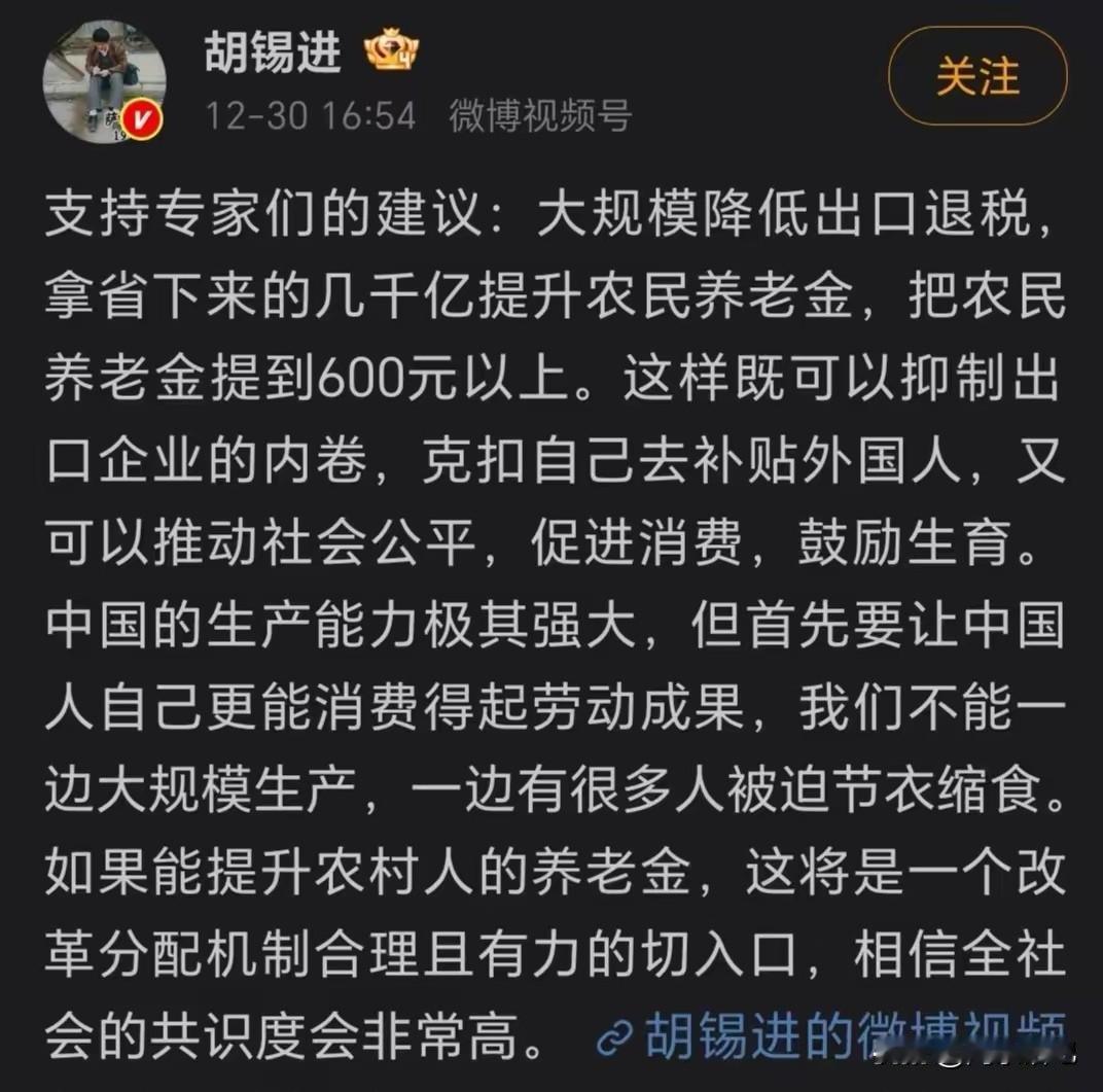 老胡到底是真明白还是假明白?现在很多专家建议大幅降低出口退税,将剩下来的钱用在提升农民养老金、促进消费和鼓励生育等方面,老胡也认同这一建议,还专门发文表示支持。不过,网上也有两派不同意见,一方支持,一方反对。支持者认为他说的在理,这钱就该这样花;而反对者认为他不懂装懂,这钱怎么能省,还让出口企业活吗?你咋认为呢?