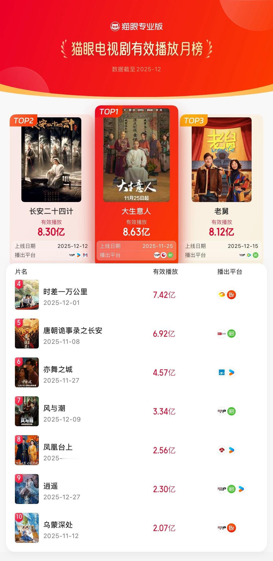 猫眼12月电视剧有效播放榜猫眼专业版2025年12月猫眼电视剧有效播放榜冠军:领衔主演电视剧《大生意人》亚军:领衔主演电视剧《长安二十四计》季军:领衔主演电视剧《老舅》猫眼12月剧集有效播放榜