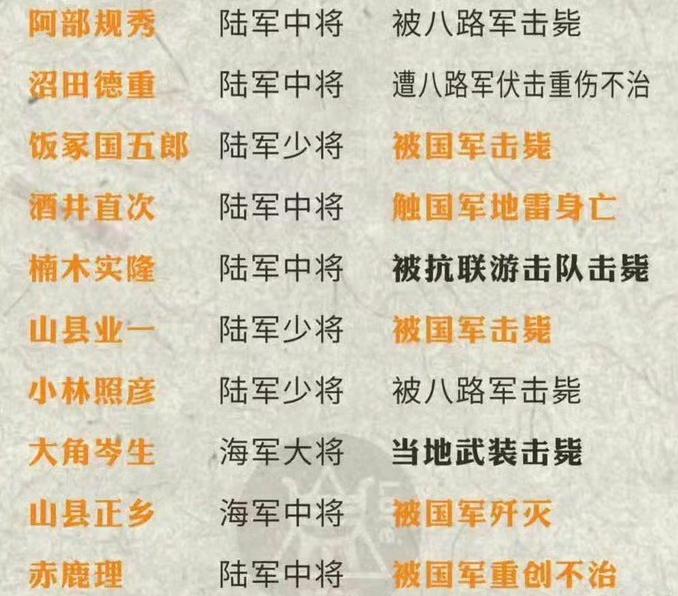 抗战中被中国军队击毙日军主要将领[赞][赞][赞] 1. 大角岑生,海军大将,1941年2月于广东中山,座机被国军地面部队击落毙命,系抗战中被击毙的日军最高军衔将领。 ​ 2. 冢田攻,陆军大将,1942年12月于安徽太湖,军机被国军击落身亡,为抗战中被击毙的日军在职最高指挥官。 ​ 3. 阿部规秀,陆军中将,1939年11月于河北涞源黄土岭战役,被八路军迫击炮击毙,日军号称“名将之花”。 ​ 4. 山县正乡,海军中将,1945年3月于浙江椒江,座机迫降后被国军歼灭,是抗战末期被击毙的日军高级将领。 ​ 5. 酒井直次,陆军中将,1942年5月于浙江兰溪战役,踩国军埋设地雷身亡,为抗战首位被地雷击毙的日军中将。 ​ 6. 中村正雄,陆军中将,1939年12月于广西昆仑关战役,被国军第五军击毙。 ​ 7. 横山武彦,陆军中将,1944年6月于浙江龙游战役,被国军第28军击毙。 ​ 8. 沼田德重,陆军中将,1939年8月于山东作战,被八路军击伤后不治身亡。 ​ 9. 吉川贞佐,陆军少将,1940年5月于河南开封,被我方地下工作者刺杀身亡。 ​ 10. 饭冢国五郎,陆军少将,1938年9月于江西庐山前线,被国军士兵以步枪远距离击毙,曾被日军记者专门拍摄宣传。