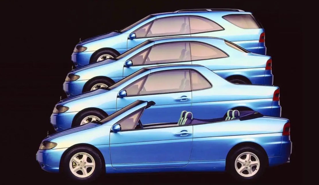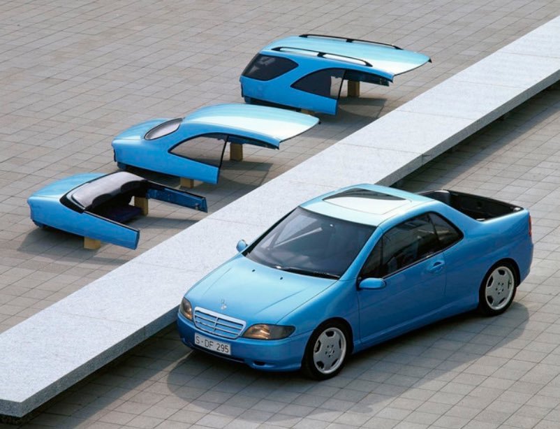 今儿来看看1995年奔驰的Vario Research Car,那时候的奔驰,还有创新精神。它是一台“四合一”的车——有轿车、旅行车、敞篷车、皮卡的造型,每个造型可以在15分钟内切换。轿车造型主管行政,敞篷车造型负责情绪价值,皮卡造型是纯工具,旅行车造型服务家庭,奔驰把这些造型全部压缩进了一台车里。Vario Research Car是一款两门、前驱、体量不大的实验性车辆,车身采用CFRP复合材料结构。四种可更换车体模块的重量只有30到50公斤。奔驰甚至想了一个“车身租赁站”:车主可以前往站点,根据需求更换车身。这台车还搭载了一套交通标志识别系统,能够识别限速标志,并在超速时提醒,是当今交通标志识别系统的雏形。Vario Research Car也是奔驰第一款在转向与制动系统上全面采用drive-by-wire的车辆,彻底取消了传统机械连接。不过,当一款车可以替代四款车时,对任何一家汽车公司来说都不是好主意,所以,它只停留在实验阶段。