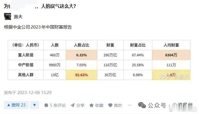 微博辟谣【2025年中金财富报告?假!什么才是真的?】(荐者按:造假、造谣、带风向是当前网络的三大流毒,令人厌恶,应遭到严厉打击。即使造假附合我们的意识也绝不能推崇。实事求是才,对症下药才是应家提倡的。)《财富分析报告》2025年的尾巴,网上突然流传出一份《中金财富分析报告》。其内容总结如下:数据显示,全国总资产约790万亿人民币。这790万亿划分又可划分为以下几部分。第一部分,国有资产360万亿,占比45.6%。第二部分,顶级富豪290万亿,占比36.7%,极少数,人均千万打底。第三部分,中产110万亿,占比13.7%,1亿不到,人均百万出头。最后,剩余13亿多人30万亿,占比3%,人均不到3万。该《报告》引用一些常人难以触及的宏观数据,来证明社会财富的严重两极分化。这个消息传播广泛。短视频平台、某乎、还有公众号,都以该数据为基点,发散出来不少文章。但我们说话做事写文章,都有一个原则,实事求是!首先,中金公司从来没有在任何官方渠道,公布任何《财富分析报告》。其次,该报告并不是最近才在网络上出现。某乎上简单搜索,就能发现,在2023年,已有回答,引用的数据一模一样。(见下图)还有,从逻辑上来说,这个数据本身也站不住脚。国家财富,居然与国家一年GDP数据,处于一个量级,这是肯定错误的。多年GDP爆发增长,社会积累的财富,至少也要高1-2个数量级,即至少千万亿左右(几个零我已经数不清了)。最后,要用几个数据,就要概括一个庞大国家和复杂社会的,最顶层宏观状况,这是不可能的。即便有,数据的准确度也要打一定折扣。上述都能说明,该报告和数据,完全是假的!我非常理解大家对这份伪造数据的认同,完全是对社会财富分配现状有不满。但是,错误的方法,不会获得理想的结果。伪造的数据,完全无法算出正确的结论。真实数据分析我们能获得的,比较有权威的数据,基本都来源于招商银行年报中,提到的金葵花客户财富分布。招商银行的私人银行服务,在国内是数一数二的。其中,金葵花是招商银行为较大金额储蓄客户提供的VIP服务。关于金葵花客户财富数据,其年报显示。2023年末,招行有1.97亿零售客户,其中有464万的金葵花客户,人数上占比是2.36%。全部零售客户总资产是13.3万亿,金葵花客户是10.8万亿,资产上的占比是81.22%。2024年末,招行有零售客户2.10亿户。其中,金葵花及以上客户523.57万户,占比2.49%。管理零售客户总资产余额14.9万亿元,金葵花及以上客户总资产余额12.2亿元,占比81.85%。总体来说,是2%的人占据80%的财富。这才是有理有据,实事求是的《报告》。当然,这个数据也不是很好看,说明我们在分配制度方面,还有很大的优化空间。但是,基于翔实可靠的数据,提出的观点,才更实事求是,更能站得住脚。网页链接