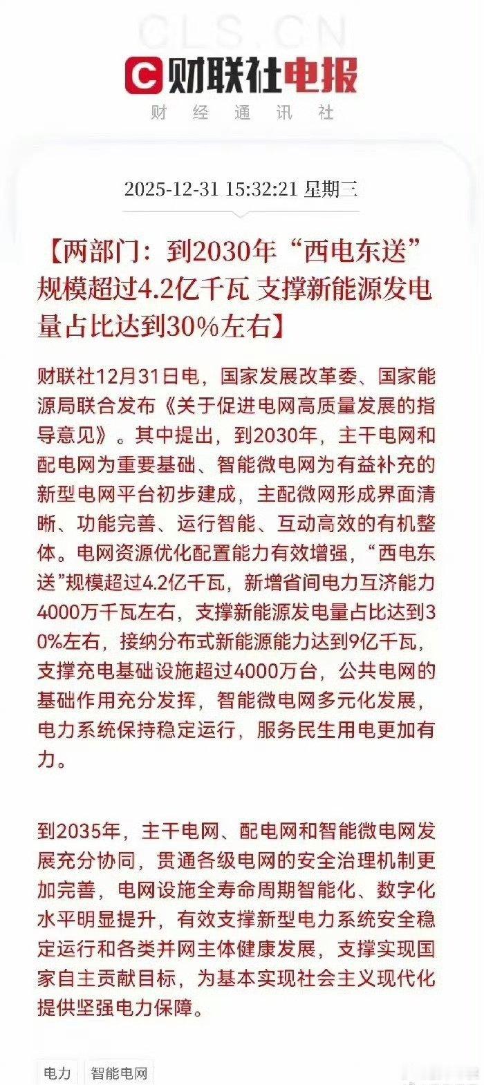 这一板块迎来重大利好!未来5-10年的电力行业发展描绘出清晰的蓝图。其核心目标是构建“主配微”协同的新型电网平台,以支撑“双碳”目标下的新能源大规模并网和消纳。“西电东送”规模超过4.2亿千瓦的目标,意味着特高压输电通道的建设将持续加码;支撑新能源发电量占比30%的要求,则指向电网智能化、灵活性改造的迫切需求;而接纳分布式新能源能力达到9亿千瓦的目标,更是凸显了配电网升级和储能配套的重要性。整体来看,这是一份覆盖电力输送、调配、消纳全链条的纲领性文件,将为相关产业链带来长期、确定性的发展机遇。受益概念股梳理(一)特高压输电领域1. 国电南瑞:电力自动化领域的绝对龙头,在特高压保护、控制及调度系统市占率第一。其柔性直流输电技术国际领先,将直接受益于特高压通道的建设和智能化改造。2. 许继电气:特高压直流输电换流阀核心供应商,市占率超过50%。公司在特高压一次、二次设备领域均有深厚积累,是电网升级的核心受益者。3. 平高电气:特高压开关设备的领军企业,国内唯一一家能够生产1100kV特高压GIS的企业。其产品广泛应用于特高压交流输电工程,将充分受益于特高压主网的扩建。4. 中国西电:国内高压、超高压输变电成套设备的核心供应商,产品覆盖特高压交直流输电的关键设备。作为行业国家队,深度参与国家电网的特高压建设项目。(二)智能电网与配网领域1. 四方股份:智能电网二次设备的核心企业,在电网继电保护、调度自动化等领域技术领先。其微电网和储能系统解决方案,将受益于“智能微电网”的多元化发展。2. 宏力达:配电网智能设备及系统解决方案提供商,其智能柱上开关产品在配电网自动化改造中应用广泛。随着配电网投资的增加,公司业绩增长确定性强。3. 科远智慧:工业自动化和信息化解决方案供应商,在电力行业深耕多年。其智能发电、智慧电厂解决方案,将助力电网的数字化、智能化升级。4. 海兴电力:智能电表和用电信息采集系统的龙头企业,产品覆盖全球90多个国家和地区。国内用电信息采集系统的升级改造,将为公司带来稳定的订单。(三)储能与电力电子领域1. 阳光电源:全球逆变器龙头,同时也是储能系统集成的领军企业。其储能变流器(PCS)市占率全球第一,将直接受益于电网侧储能和新能源配套储能的需求爆发。2. 宁德时代:动力电池全球龙头,在储能电池领域同样布局深厚。其大容量储能解决方案已在多个电网侧项目中应用,技术和成本优势显著。3. 科士达:专注于数据中心UPS和储能系统的企业,其储能变流器和系统集成能力突出。在电网侧和用户侧储能项目中具有丰富的项目经验。4. 上能电气:储能变流器(PCS)的核心供应商,技术性能指标行业领先。公司深度参与国内多个大型储能电站项目,受益于储能装机规模的快速增长。(四)新能源发电与运营领域1. 三峡能源:国内最大的新能源发电运营商之一,以风电和光伏为主。作为“西电东送”的重要电源点,公司将受益于西部新能源基地的开发和电力外送通道的完善。2. 龙源电力:国家能源集团旗下的新能源平台,全球最大的风电运营商。其在风电技术和运营管理方面的优势,将支撑其在新能源领域的持续扩张。3. 晶科能源:全球领先的光伏组件制造商,同时向下游光伏电站开发延伸。公司在N型高效组件领域技术领先,将受益于全球光伏装机需求的增长。4. 隆基绿能:光伏单晶硅片和组件的全球龙头,技术和成本优势显著。其在光伏电站EPC领域的布局,将受益于西部光伏基地的大规模开发。(五)电网信息化与安全领域1. 东方电子:电力自动化及信息化解决方案提供商,在电网调度、配电自动化等领域经验丰富。其电网数字化平台和大数据分析能力,将助力电网的智能化升级。2. 远光软件:电力行业管理软件的龙头企业,为电网企业提供财务、供应链等信息化解决方案。随着电网企业数字化转型的推进,公司产品需求将持续增长。3. 恒华科技:专注于电力行业的信息化服务商,提供从规划设计到运营管理的全生命周期解决方案。其BIM技术在电网工程设计和管理中应用广泛。4. 卫士通:信息安全领域的国家队,为电力等关键行业提供密码产品和安全解决方案。在电网智能化和数字化的背景下,网络安全的重要性日益凸显。总结这份政策的发布,标志着我国电网建设进入了以“高质量”和“智能化”为核心的新阶段。未来五年,电力行业的投资将持续向特高压、智能电网、配电网升级、储能配套等领域倾斜。特高压输电作为“西电东送”的物理载体,是最直接、最确定的受益方向;智能电网与配网升级则是提高新能源消纳能力的关键;储能作为解决间歇性问题的核心手段,将迎来爆发式增长;而新能源运营商则将成为政策红利的最终受益者。本文涉及资讯、数据等内容来自网络公共信息,仅供参考,不构成投资建议!a股今日看盘投资股票
