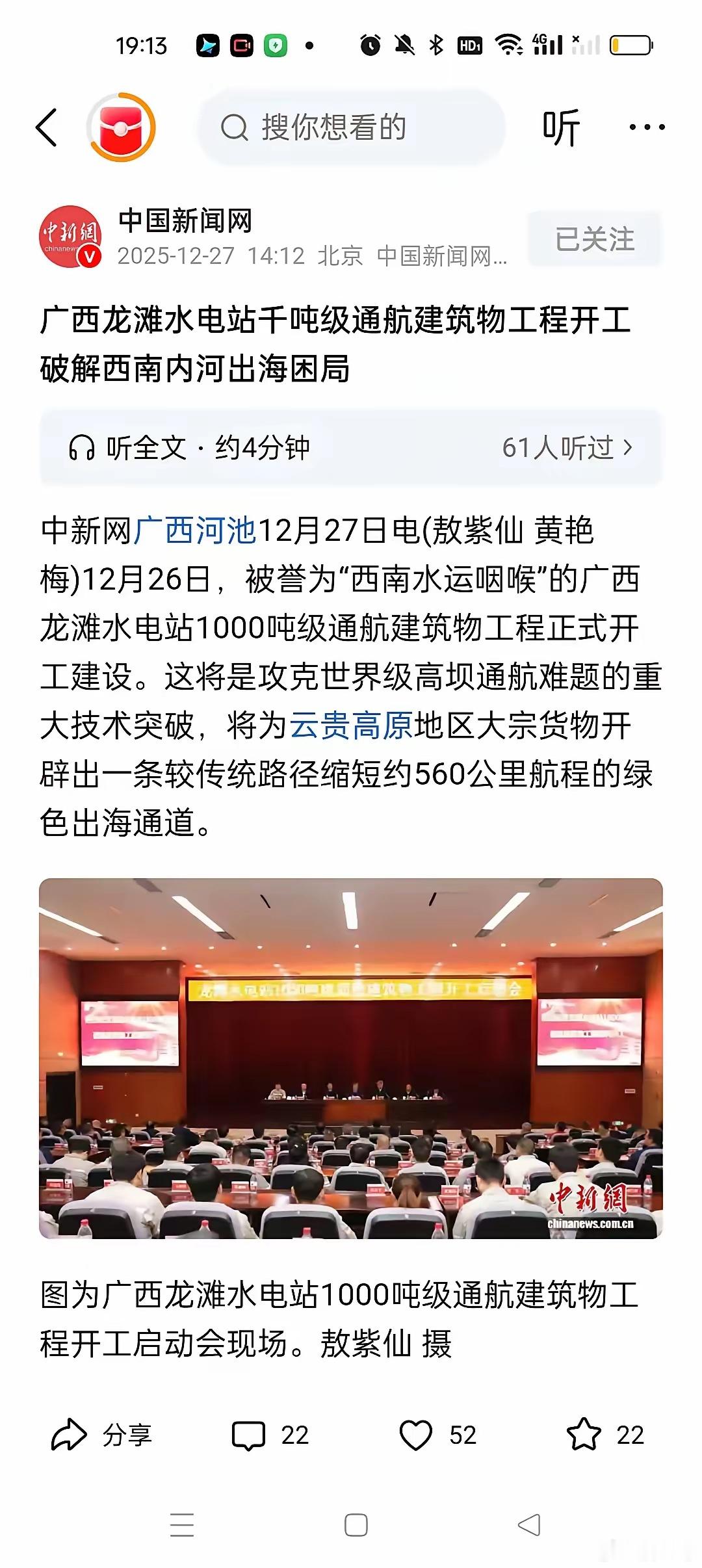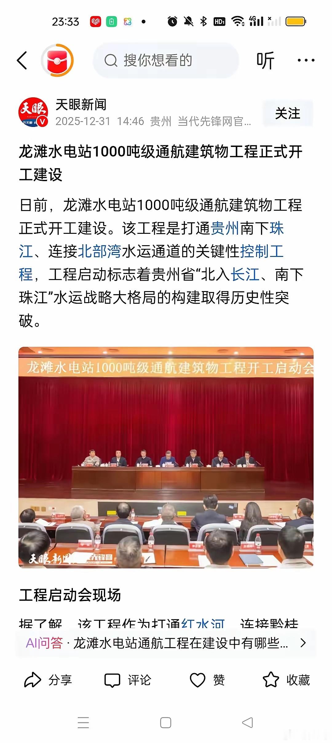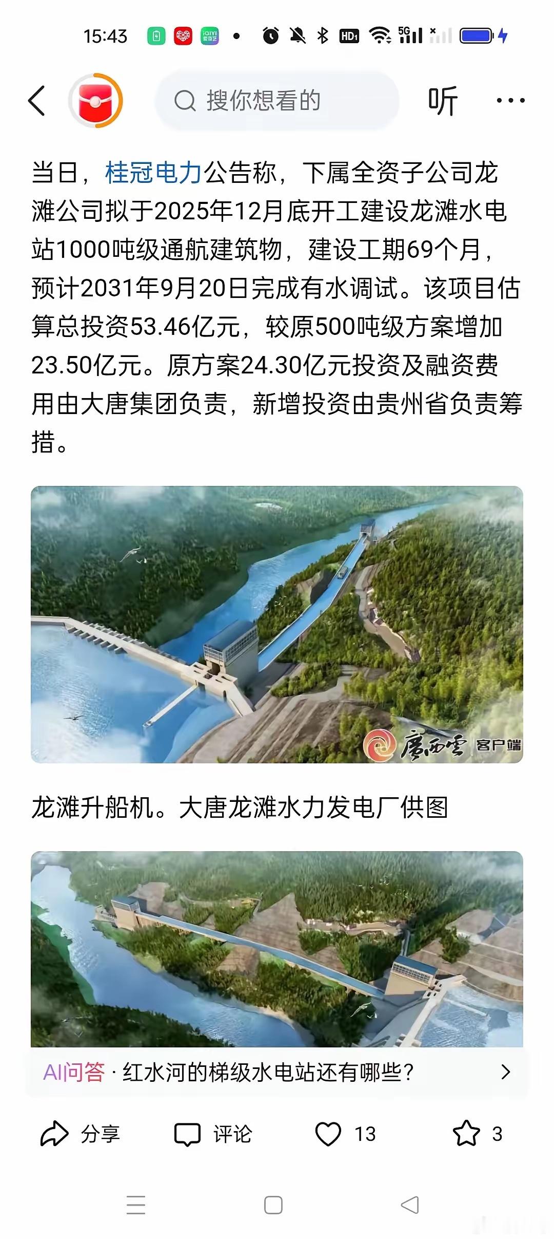 2025年12月28日。广西河池市天峨县红水河大唐龙滩水电站 1000吨航运内河正式开工建设。桂冠电力公告称,建设工期69个月,预计2031年9月20日完成有水调试。该项目估算总投资53.46亿元,较原500吨级方案增加23.50亿元。原方案24.30亿元投资及融资费用由大唐集团负责,新增投资由贵州省负责筹措。这给隔壁的贵州 黔西南州地级市望谟县、贞丰县、册亨县 三个码头带来无比的辉煌和天大的利益 还有安顺市的镇宁县、黔南州罗甸县 ,让贵州的经济插上腾飞的翅膀,再创辉煌!创造利益最大化,当然还有隔壁的云南富宁县 ,贵州云南两地 港口码头通过广西红水河。南北盘江经过平陆运河和珠江水运 到达北部湾出海口和珠三角出海口 使企业达到利益最大化!