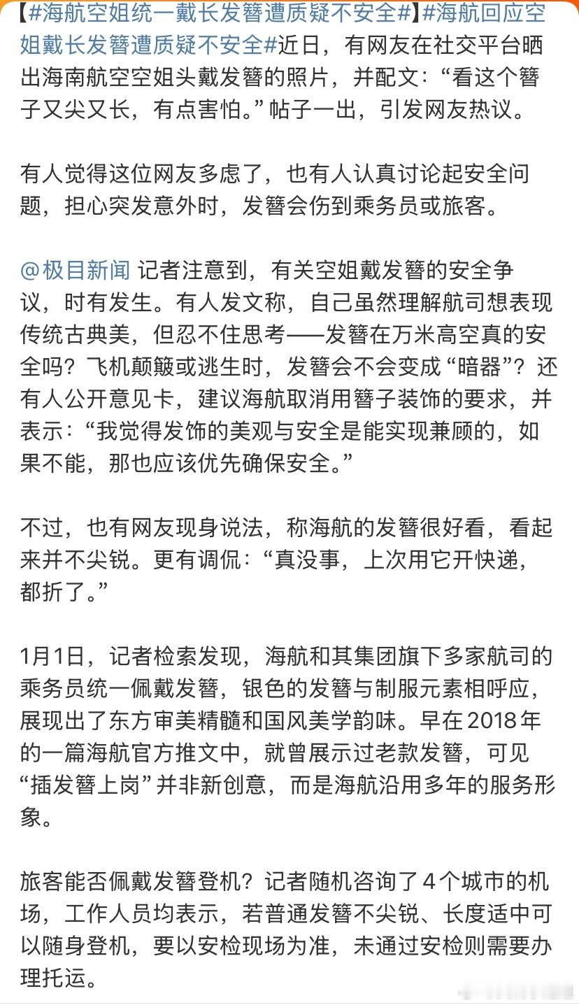 海航空姐统一戴长发簪遭质疑不安全肯定不安全啊,我们开车都知道,方向盘上不要贴钻之类的尖锐物品,也不要带鳄鱼夹之类的开车,因为突如其来的危险根本不会给你应变的机会,何况是飞机上如果真的为了装饰,其实可以出于安全思考,想些其他的装饰