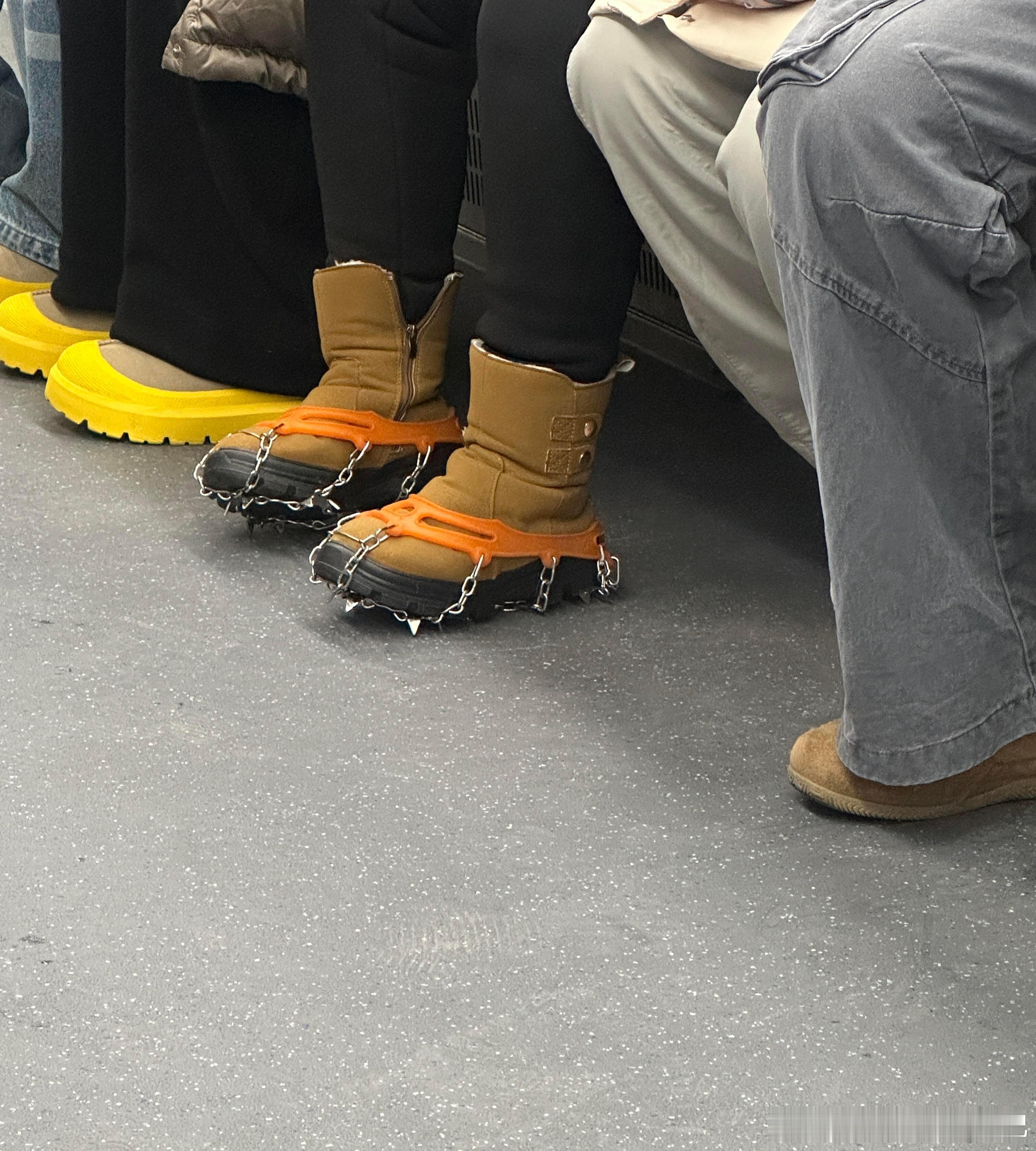 南方人为了防摔也是拼了坐地铁看到惊呆了,防滑链都干上了
