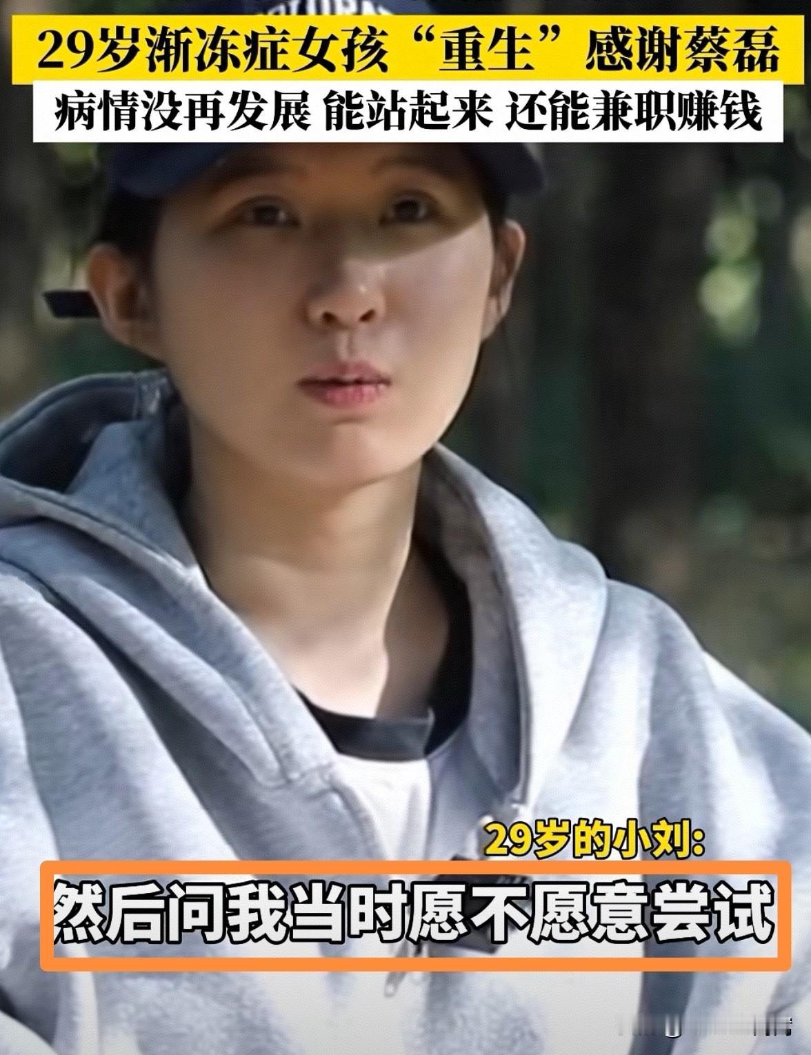 在绝症界,蔡磊绝对是“标杆”一样的存在!我们常常说,自己淋过雨的人,所以会更懂得给别人撑伞,这是很温暖的给予! 新年伊始,29岁渐冻症女孩小刘重生感谢蔡磊:“吃了2年蔡磊团队研发药物,病情没再发展,已经能站起来,独居照料自己,还能兼职赚钱。” 小刘连线蔡磊时称自己不知道该如何报答。而蔡磊摇头:不需要报答,她是200年来最幸运的那批人,希望她好好珍惜生命,创造有价值的人生。 蔡磊抗击渐冻症业界举世瞩目,相信有蔡磊的坚持,有资本的参与,渐冻症必然被攻克。目前已经有多名渐冻症患者使用治疗药物后回归健康生活,摆脱死神。 我也一直相信,这个世界上绝症从来不是生命的“死结”,其实我们每个人都是在借命而生!像蔡磊一样,每一项科研的攻坚都是人类新的起点,后来者只会越来越好! 蔡磊也是个英雄,值得我们敬重!我常常会想,这个世界上很多所谓的绝症其实是可以治疗的,只是得看我们的命有没有性价比而已!比如癌症、乙肝、糖尿病等等,只要有大资本真的愿意参与,其实每个人的命都可以向阳而生!你们明白我的意思么? 2025年已成过去,2026年了,希望有更多的“蔡磊”式的旗帜人物为了人类的健康肯站出来。爱是看见,越是寒冷,我们越能体会温暖的重量!超人不会飞,但心可以飞扬!为所有的“蔡磊们”加油! 蔡磊说渐冻症的历史已被改写 渐冻症