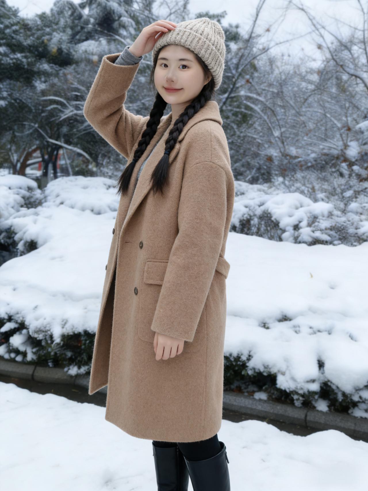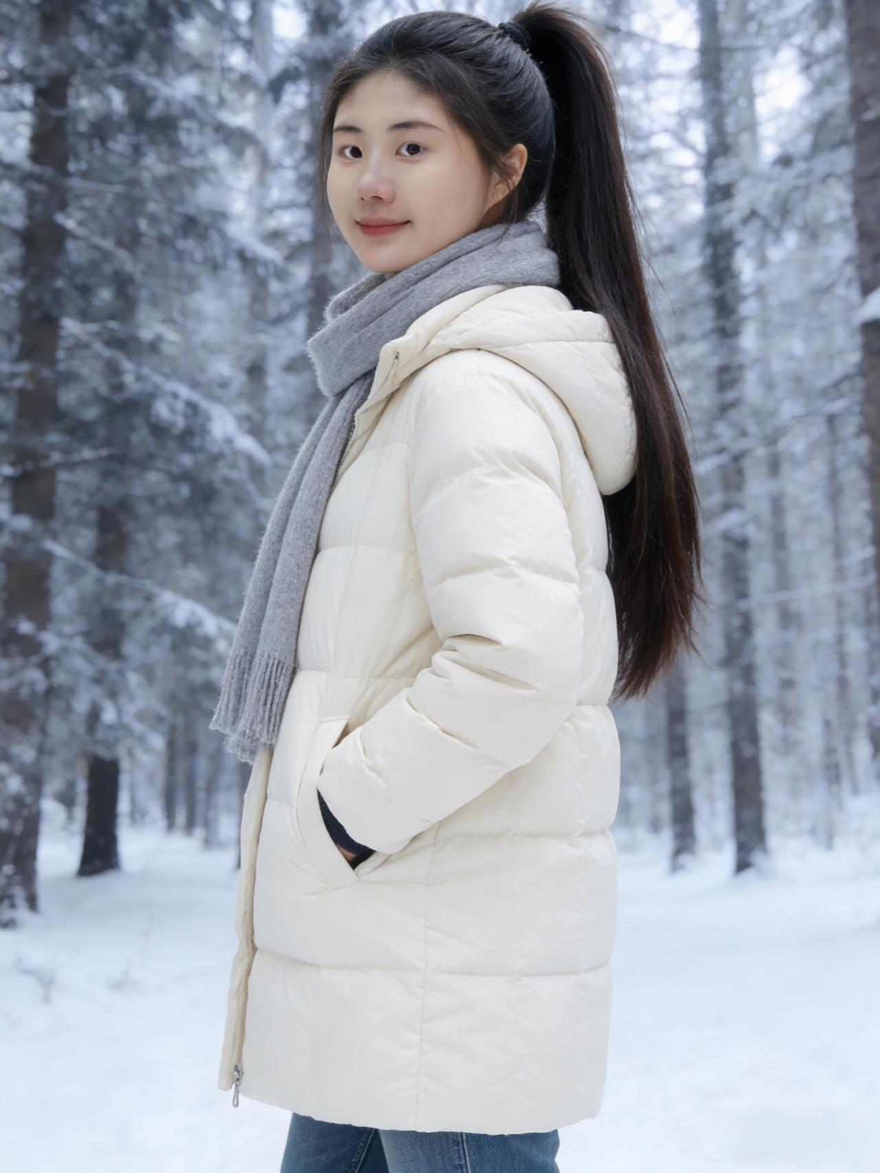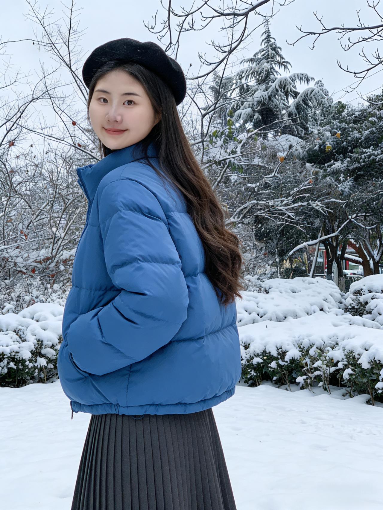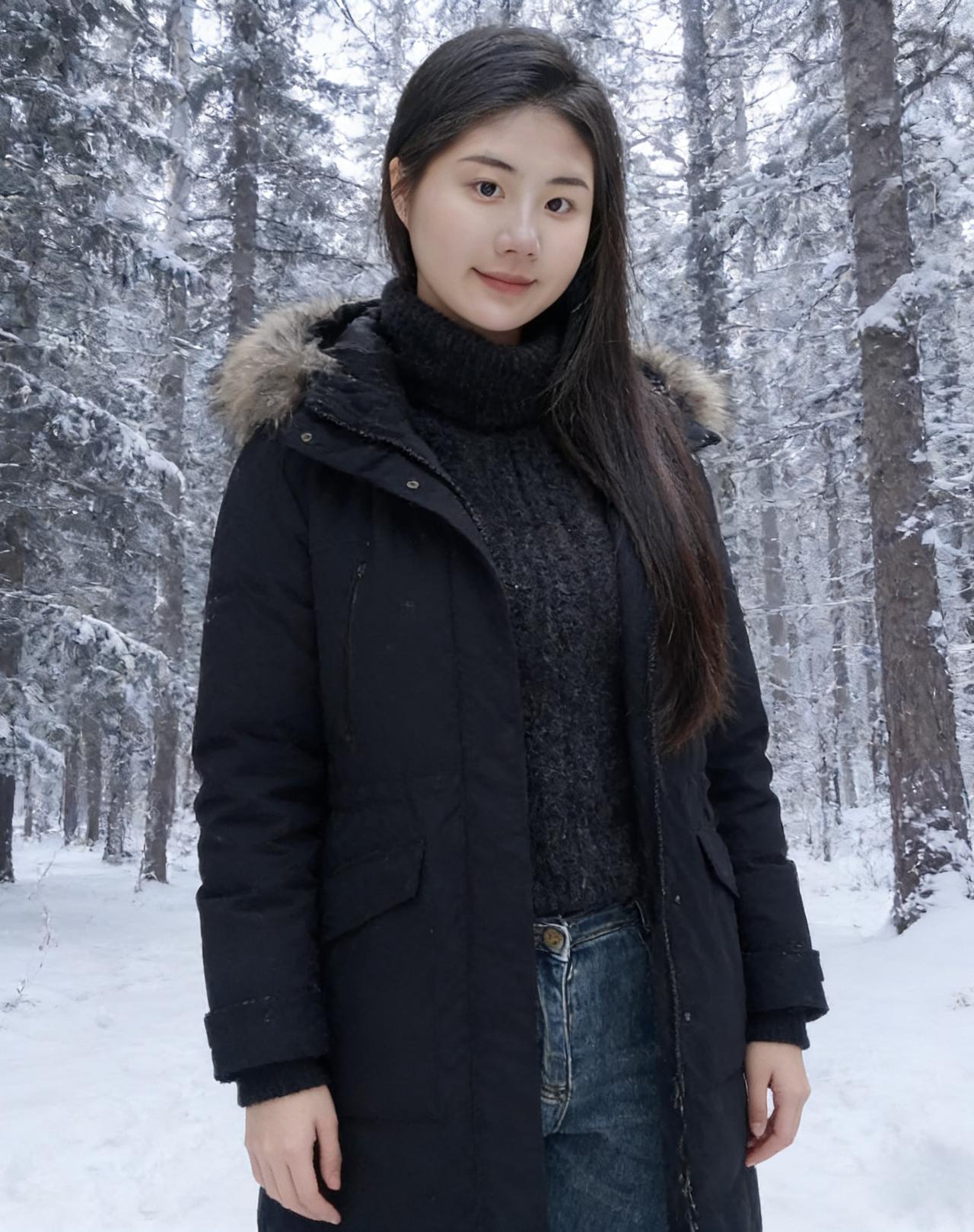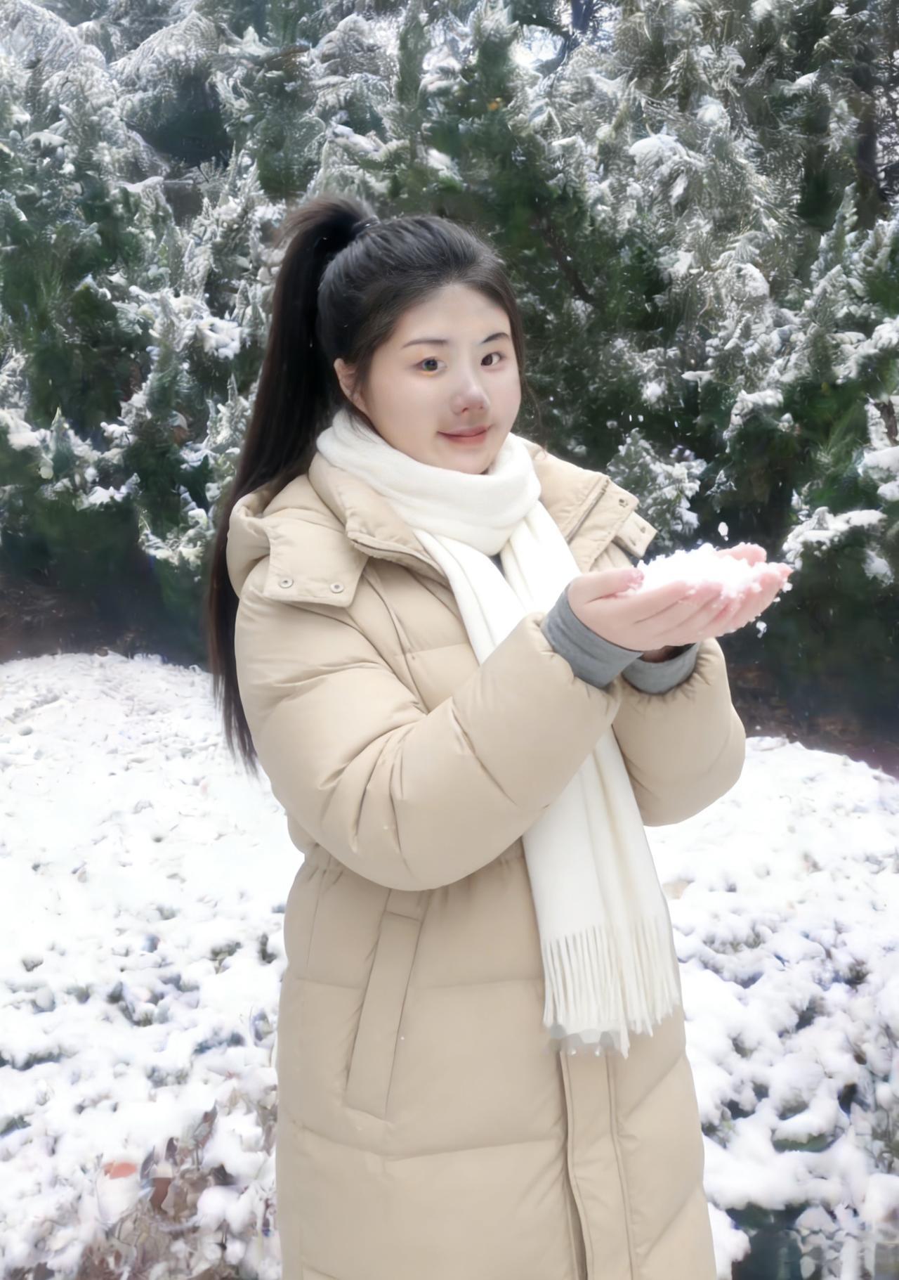 琼英漫舞覆荒榛,松柏凝霜色更匀。 素袂轻扬承冷絮,长发垂肩映雪垠。 眸含清浅千山静,身立苍茫一径新。 莫道冬深无暖意,嫣然浅笑胜阳春。