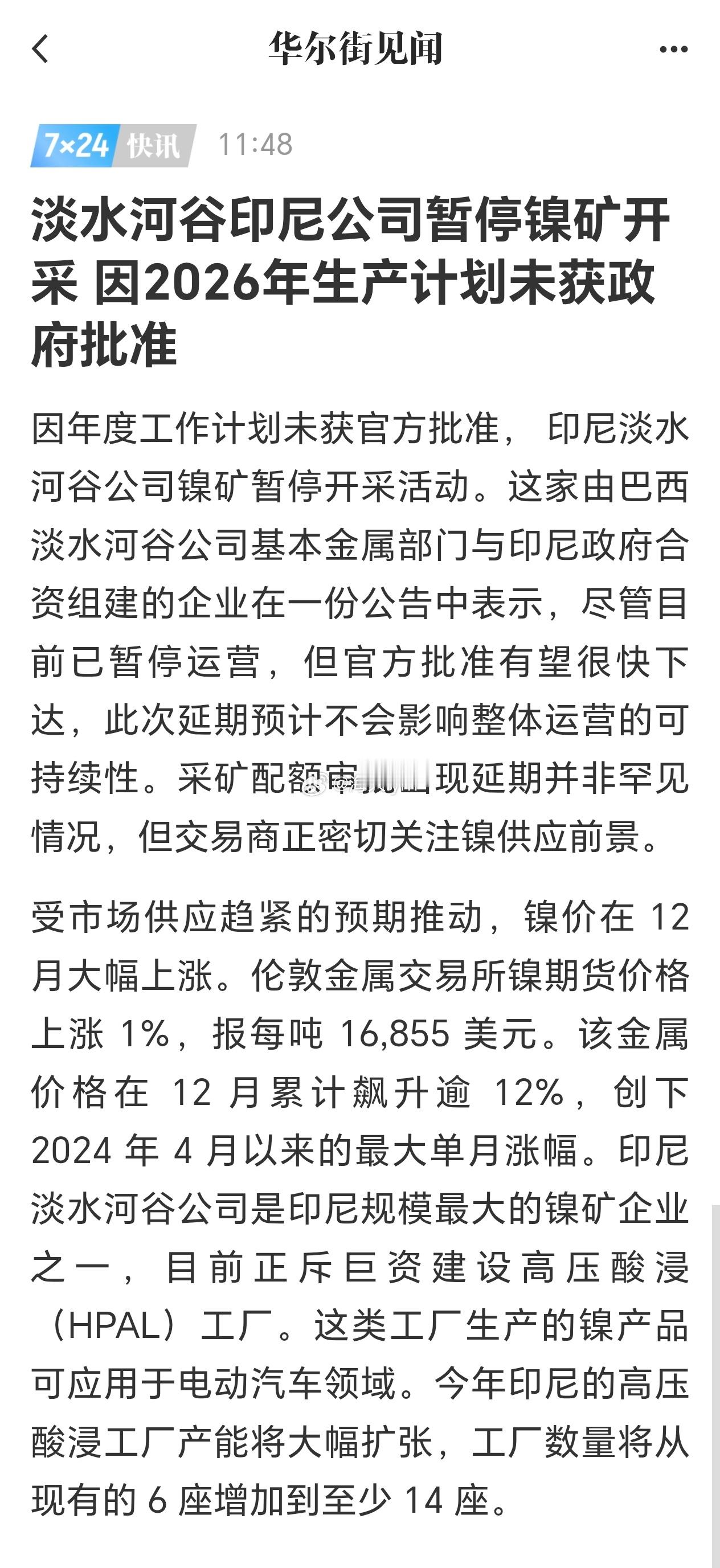 淡水河谷印尼公司暂停镍矿开采 因2026年生产计划未获政府批准因年度工作计划未获官方批准, 印尼淡水河谷公司镍矿暂停开采活动。这家由巴西淡水河谷公司基本金属部门与印尼政府合资组建的企业在一份公告中表示,尽管目前已暂停运营,但官方批准有望很快下达,此次延期预计不会影响整体运营的可持续性。采矿配额审批出现延期并非罕见情况,但交易商正密切关注镍供应前景。受市场供应趋紧的预期推动,镍价在 12 月大幅上涨。伦敦金属交易所镍期货价格上涨 1%,报每吨 16,855 美元。该金属价格在 12 月累计飙升逾 12%,创下 2024 年 4 月以来的最大单月涨幅。印尼淡水河谷公司是印尼规模最大的镍矿企业之一,目前正斥巨资建设高压酸浸(HPAL)工厂。这类工厂生产的镍产品可应用于电动汽车领域。今年印尼的高压酸浸工厂产能将大幅扩张,工厂数量将从现有的 6 座增加到至少 14 座。沪镍沪镍期货