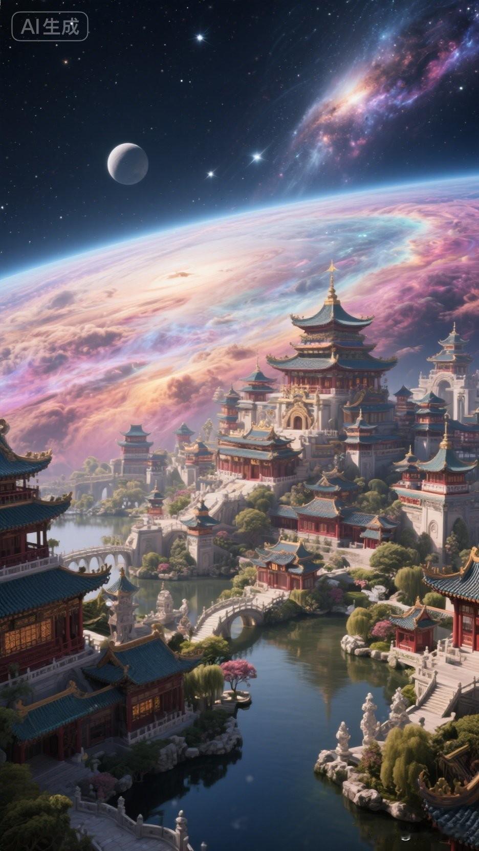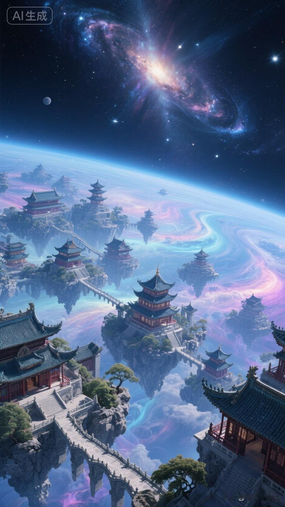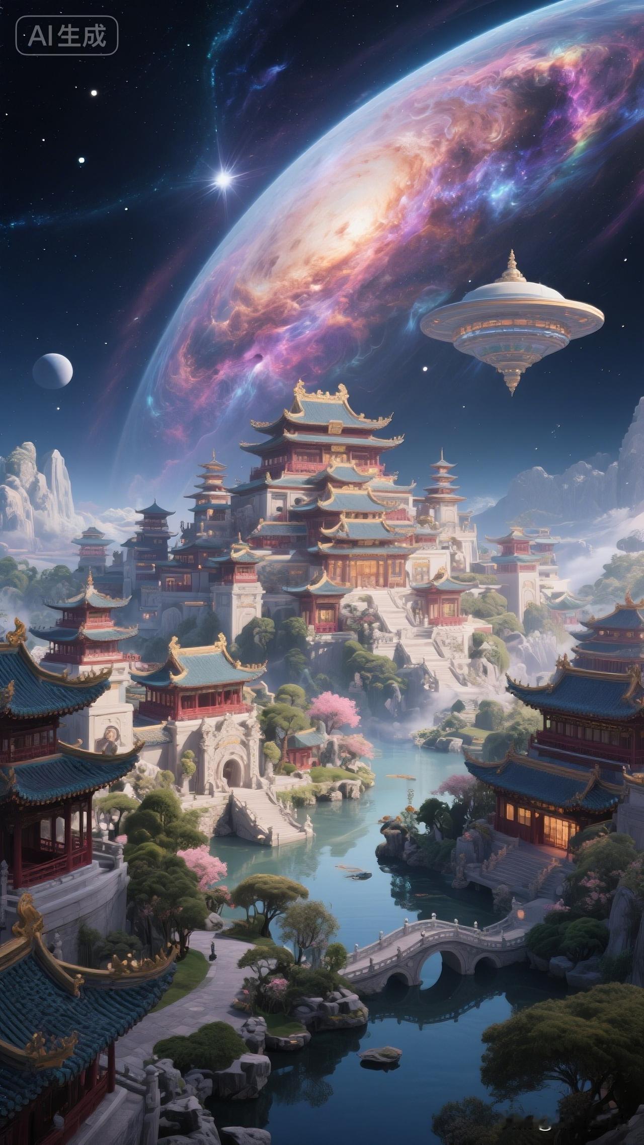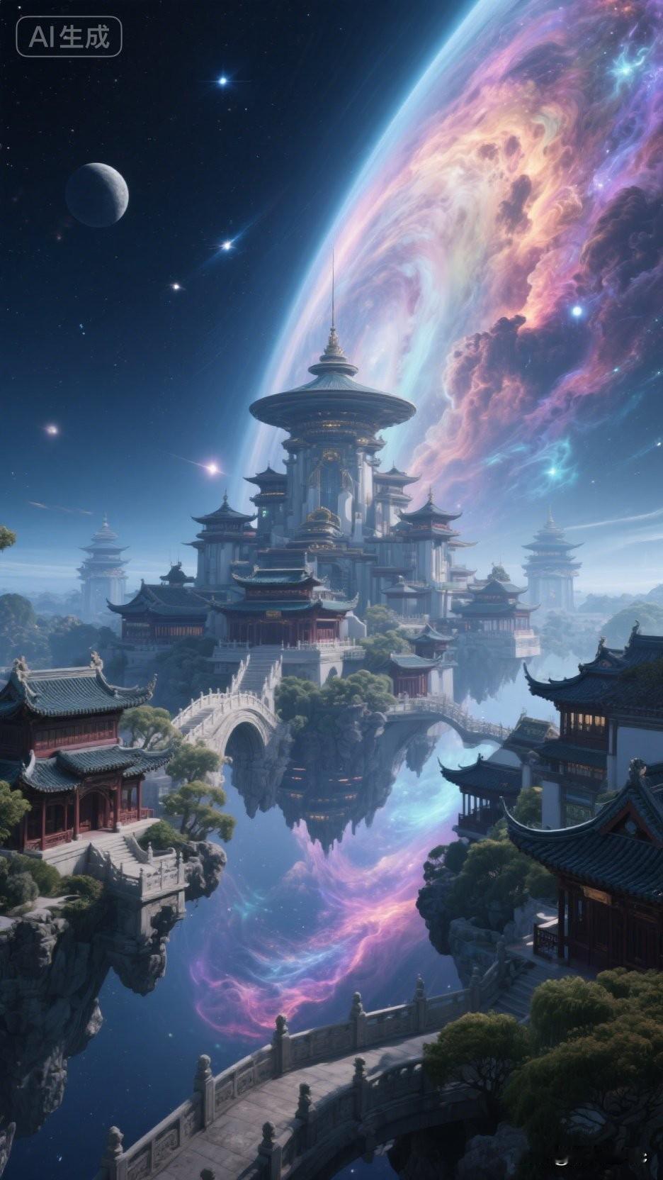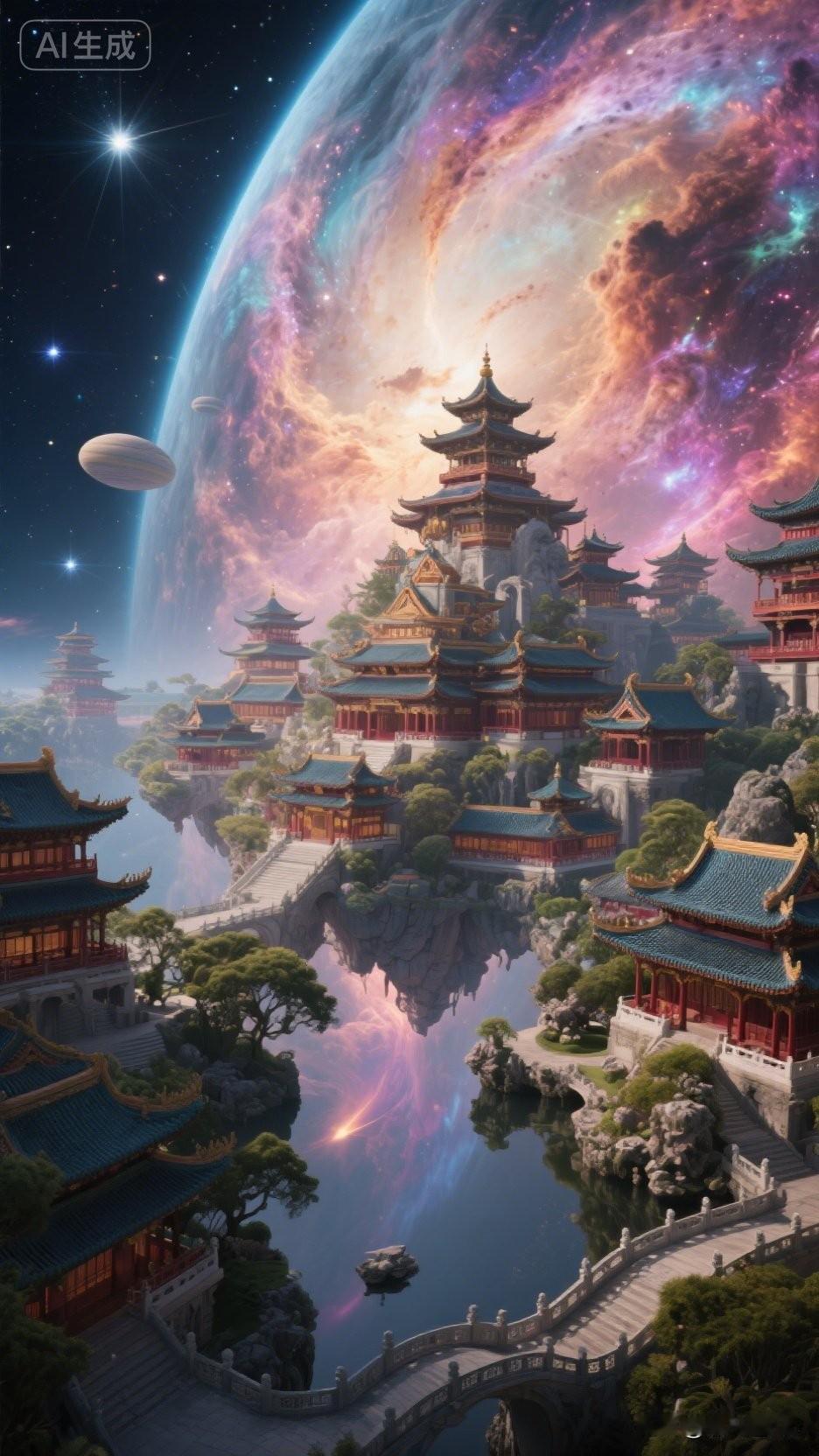 仙境浮云端,楼阁映星河。