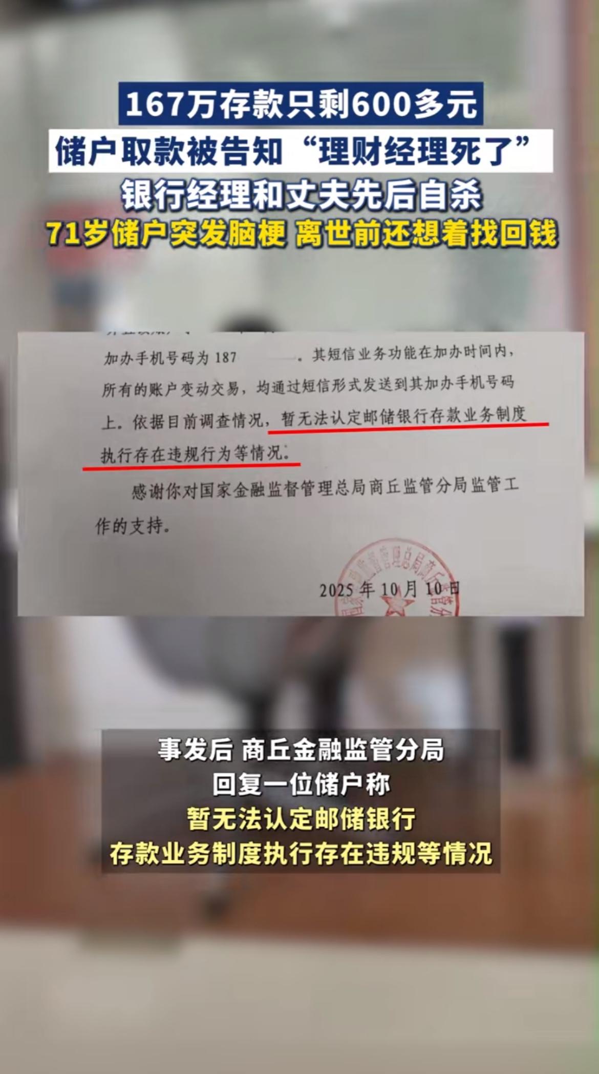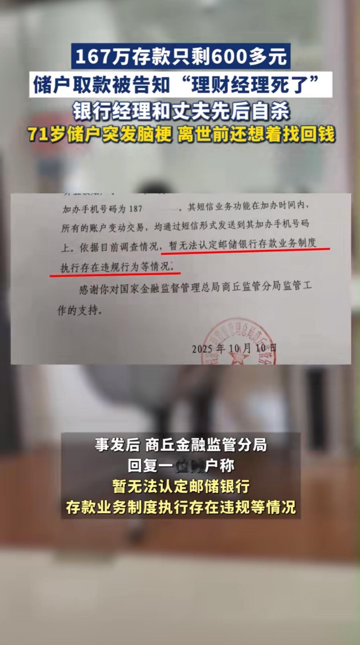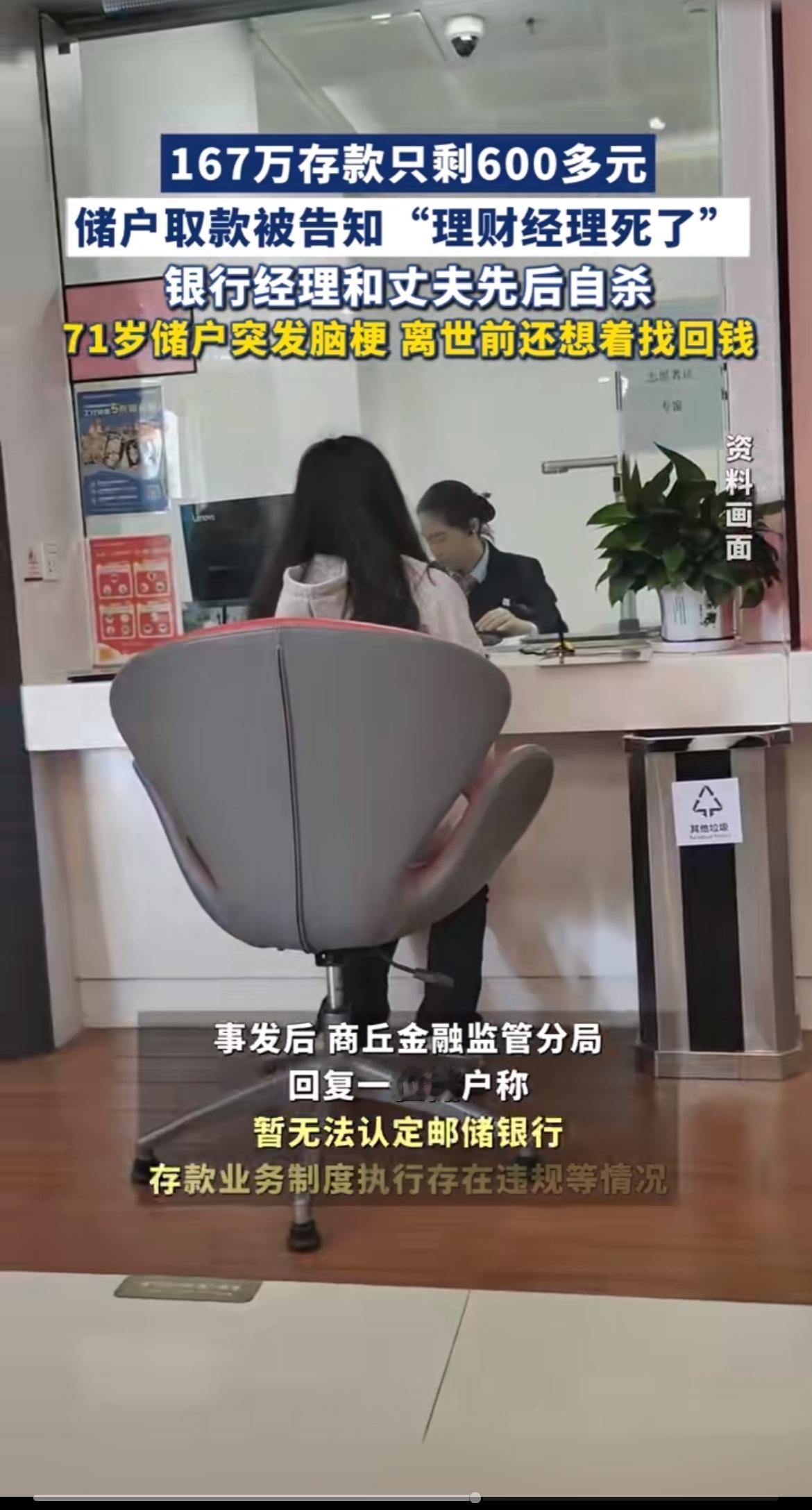 太离谱了!河南商丘,72岁的陈某芝去银行取167万存款,竟只剩600多元,理财经理死了。她71岁的丈夫当场瘫倒脑梗离世,到死都惦记着这钱。还有丽丽,儿子结婚取钱,78万只剩4519.04元,也是理财经理王某姗出事了。 调查发现,王某姗从2017年就利用职务之便,把储户钱转到亲友账户,涉及12个账户超1000万,加上民间借贷共3000多万,受害者多是中老年人。后来王某姗自缢,她丈夫烧炭自尽,留下一对幼女。而银行还称暂不能确认违规。储户的钱就这么没了,银行真没责任吗?太让人生气了!