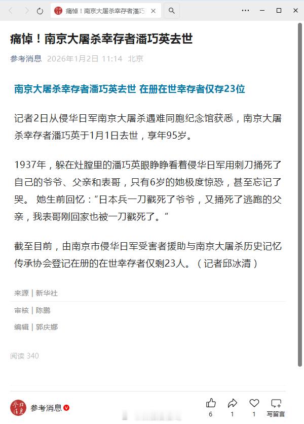 南京大屠杀幸存者潘巧英去世 南京大屠杀惨案89周年 希望能够早日为南京大屠杀遇难者同胞讨回公道,哎!!!南京大屠杀幸存者仅剩23位