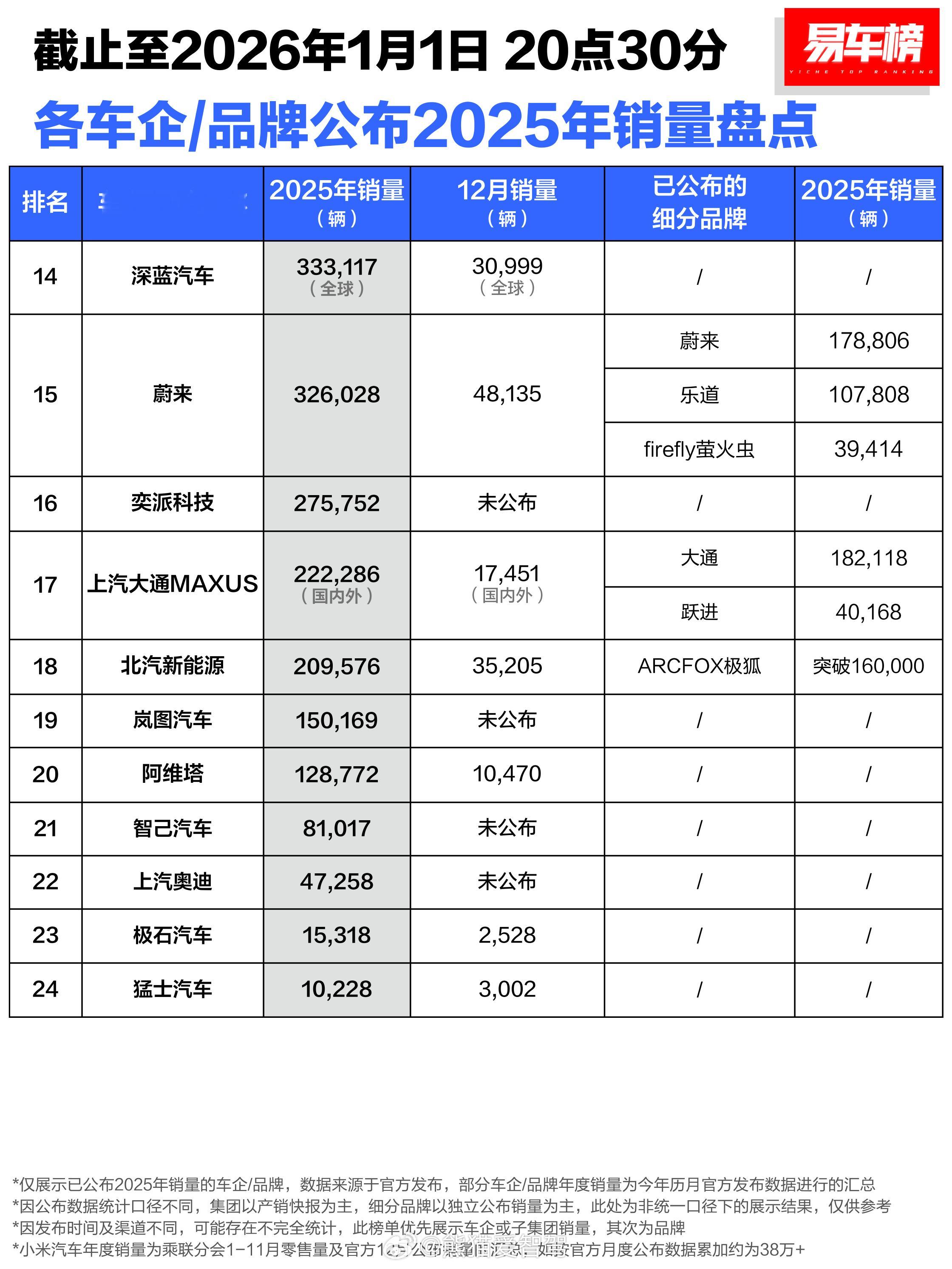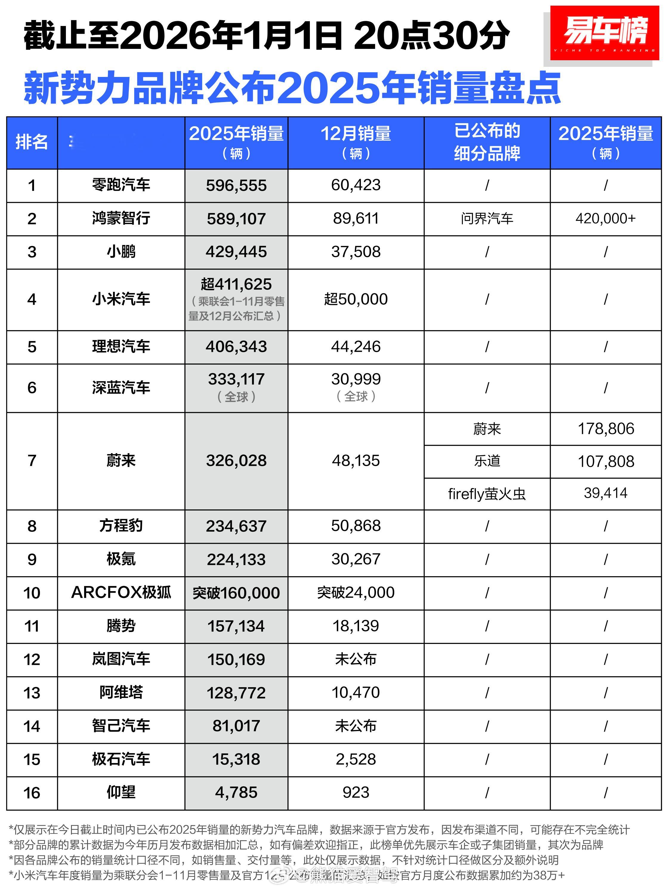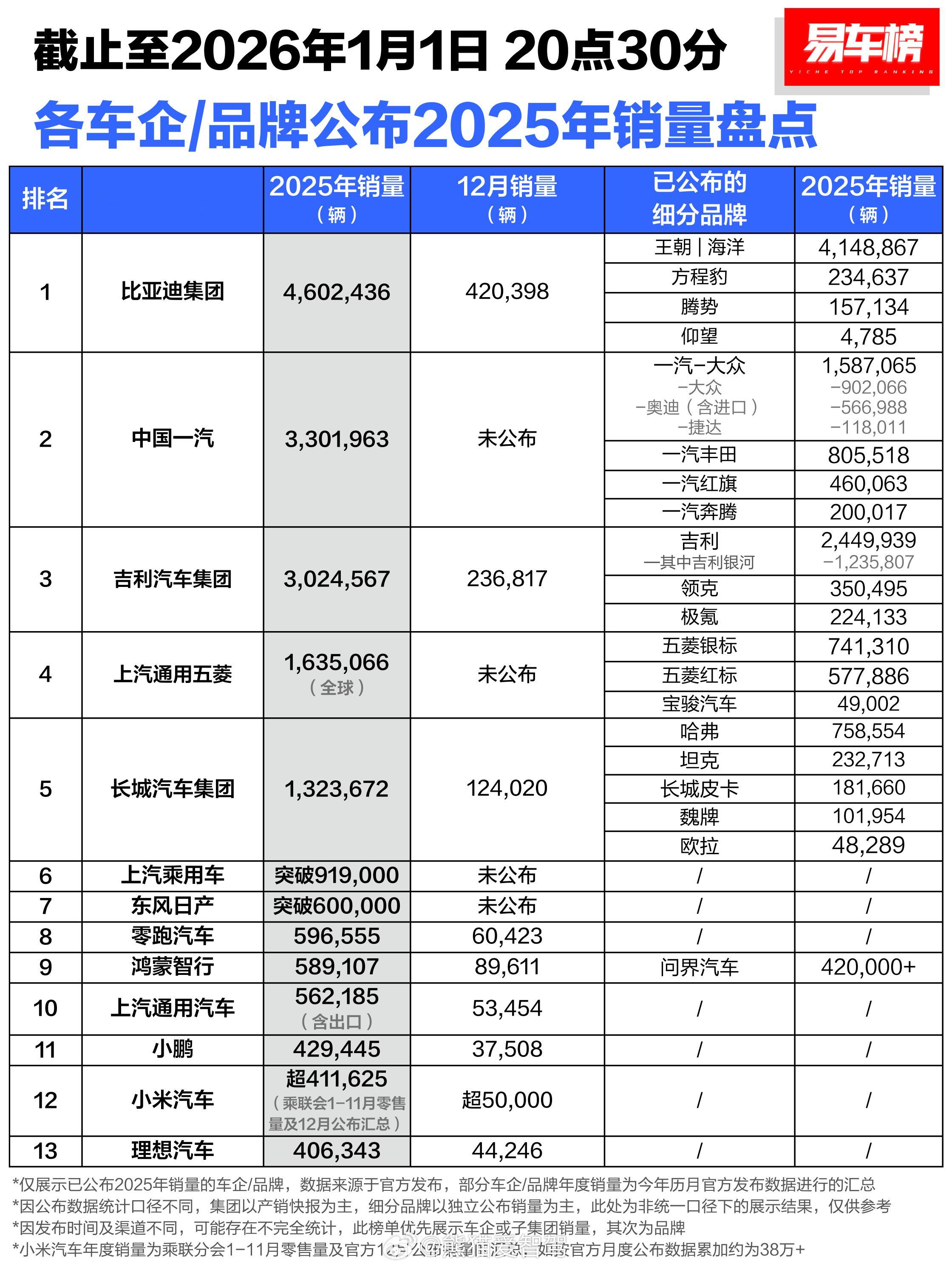 据易车数据统计发布,2025年全年各车企、品牌发布的整理出来了部分数据,来看看你关注的品牌或车企在2025年的发展如何!传统车企依然保持着一个高销量以及海外出口的不错成绩,新势力基本都在12月创下了自己品牌交付的新纪录!对此大家怎么看待2026年各个车企、品牌的发展,会一如既往的像今年一样持续不断的创造新高吗?汽场全开新能源汽车2026汽车发展