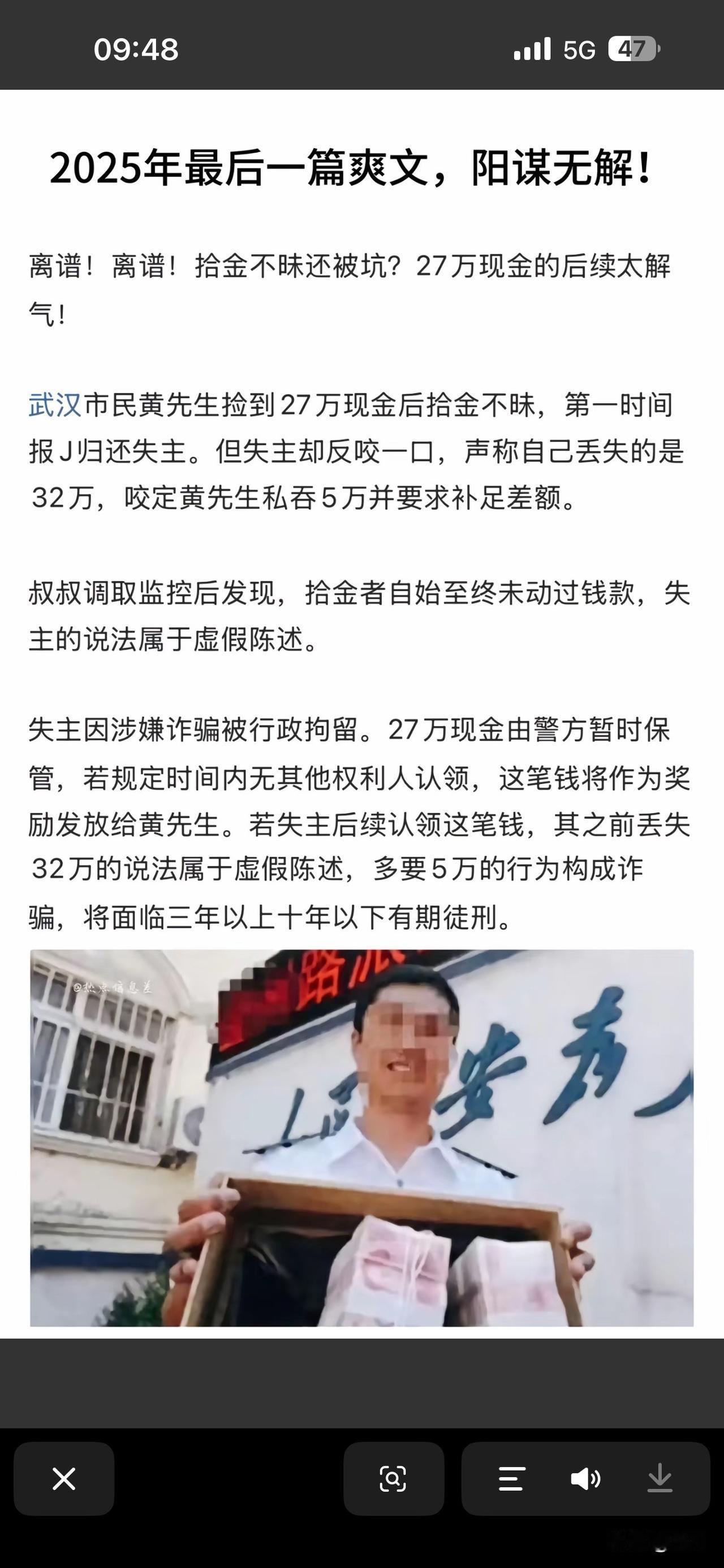 近期小编发现武汉市民捡到一27万的包裹,报警后归还失主。但失主说少了5万并要求补足差额。 经过警察的调取监控后发现从始至终没有动过钱。针对此事,警察直接封闭这27万。将失主进行诈骗进行行政拘留。 如果后期无人认领,那就将这27万奖励给拾金不昧者,如果失主认领。则认为其诈骗,进行拘留。真的是一举两得,针对此事,大家怎么看?拾金不昧后索要报酬违法吗?
