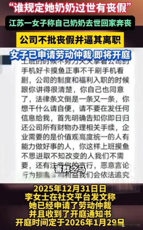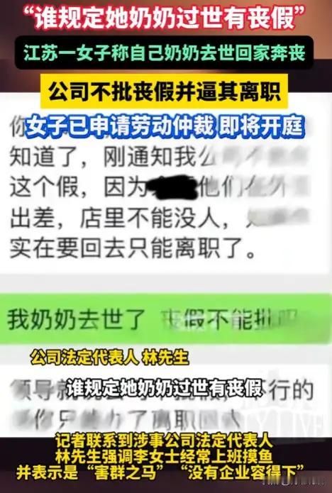 江苏常熟,李女士的一段坎坷经历掀起了社会热议。作为一名普通的公司文员,面对家中王奶奶的离世,本应得到体恤的人性关怀,却被公司无情地推搡在了风口浪尖。她提前按照流程向经理和人事部门申请了5天事假,甚至已经买好回家的高铁票,没想到却被人事告知,总公司的法人不批假,除非她“主动离职”才能回家奔丧。这样冷冰冰的“规定”,让多少人心头一紧,难道在最需要安慰和支持的时刻,员工只能被逼着选择“离开”? 更令人心寒的是,丧事处理完毕后,公司却以“上班摸鱼”为由将李女士开除,还拖欠工资不说,连应有的社保缴纳也没落实。一个本该获得同情的人,反被推向了舆论风口浪尖和经济困境,李女士的遭遇引发了无数网友的共鸣和愤怒:“做员工的难道只是活该被剥削吗?最基本的尊重和保障都没有!”“这家公司哪里有人情味?法律和道德双双缺席。” 但这起事件同时暴露了更深层的问题:企业管理的冰冷与法律执行的滞后,让普通劳动者的权益成为被忽视的角落。我们看到的,不只是李女士的悲剧,而是数以万计职场人在制度和现实夹缝中的挣扎和无助。家丧本应是人生最艰难的时刻,理应获得全社会及企业的理解与支持,却因一纸规定而让她选择“离职”还是“失去亲情”的残酷抉择。 这起事件也敲响了警钟:职场人,尤其是普通劳动者的合法权益保护,亟需更有力的法律保障和执行。企业不仅要履行法律义务,更要具备基本的人文关怀。在这场公义与温情的较量中,每一个李女士,都不应孤单无助。 职场员工自述 苏州打工阿姨