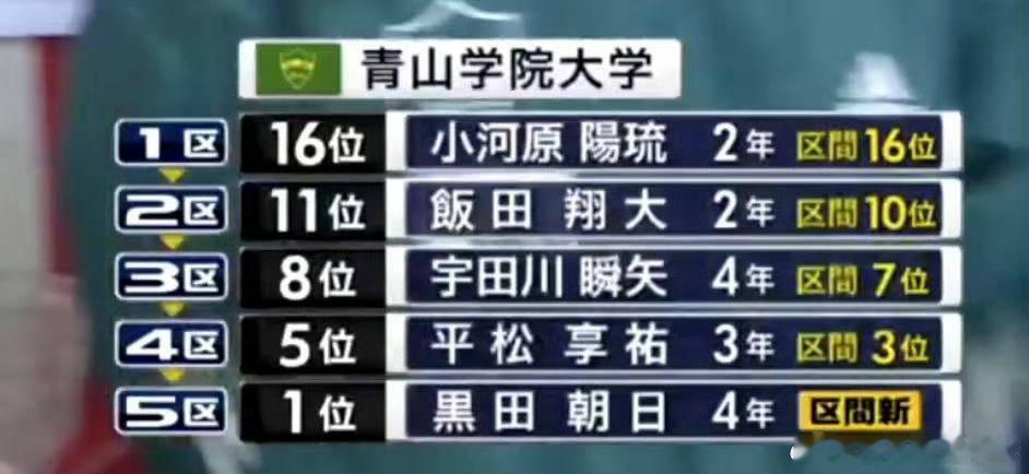 青山学院从第一棒第16,到第5棒逆袭第1,卫冕冠军对于比赛节奏的掌控确实厉害。不过比赛只进行了一半,明天早上7点(北京时间)看另一半,或许还有更多惊喜。黑田朝日大逆转箱根驿传
