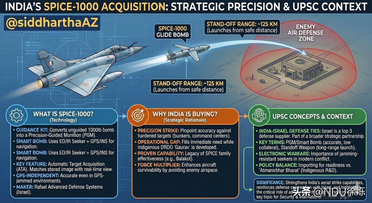 🔴🇮🇳🇮🇱印度与以色列签署87亿美元“斯拜斯-1000 ”(SPICE-1000)滑翔制导炸弹采购合同🔴 金砖新闻 2026年1月2日 印度国防部长拉杰纳特·辛格表示,“国防采购委员会”(DAC)近日批准了一项总价值约87亿美元(7900亿卢比)军事采购计划。采购清单中包括向以色列拉斐尔公司采购的约1000套“斯拜斯-1000 ” 远程精确制导套件,此举将显著提升印度空军(IAF)远距离防区外打击高价值目标的能力。除该制导炸弹组件外,此次获批的采购清单还包括空空导弹、巡飞弹、火箭炮、雷达及其他各类武器系统。 印度国防领域这笔采购反应了其或将面临战争的紧迫举动,成熟可靠的武器系统成为优先选择方案,以实现快速列装部署的目的。 “斯拜斯-1000”是一款适配500千克级(1000磅级)航弹的防区外空对地精确制导组件,可将常规非制导炸弹改装为具备自主作战能力的“智能”武器。系统射程为100-125公里,可使载机规避多数防空火力圈 ,其制导方式融合了光电图像匹配算法与惯性导航技术,可在无GPS制导情况下完成目标打击,具备抗干扰能力,圆概率误差(CEP)小于3米。 印度军方表示,将把SPICE-1000集成至"阵风"、苏-30MKI战斗机中队,未来可能扩展至"光辉"轻型战机。对印度空军,这款武器填补了“斯拜斯-2000”重型制导炸弹与国产轻型滑翔炸弹之间的火力空白,凸显了印度对多层次打击和空战能力的重视,而非单一平台解决方案。 与“斯拜斯-1000”同步获批采购的还包括多款高端弹药,具体包括“阿斯特拉 MK-II”超视距空空导弹、为“阵风”战机增购的“流星”导弹、巡飞弹、远程“皮纳卡”火箭弹以及新型雷达系统。 印度官方尚未公布这批装备的交付时间表及单位成本,但7900亿卢比的采购金额已在国内引发广泛关注,尤其是在印度国产同类武器系统即将服役的背景下,这笔采购的关注度变得更高。 印度空军曾在2019年巴拉科特空袭行动中使用“斯拜斯-2000”(SPICE-2000) 制导炸弹,在印巴紧张局势加剧的同年,又紧急采购了100多套该型弹药。 印度和以色列媒体援引斯德哥尔摩国际和平研究所(SIPRI)的数据称,2020至2024年间,印度采购订单占据了以色列军贸出口总额的约34%,是拉斐尔公司的最大海外客户。 印度媒体称,国防采购委员会最终倾向于选择“斯拜斯-1000”,主要是看重其技术成熟度以及可快速交付列装的优势。尽管印度国防研究与发展组织(DRDO)正在研发“高拉夫Gaurav”等国产滑翔炸弹。这一决策再次凸显印度国防采购的一贯模式:在推进国产武器研发项目的同时,针对现役装备体系中仍存在的战力缺口,选择性地从国外进口武器装备。