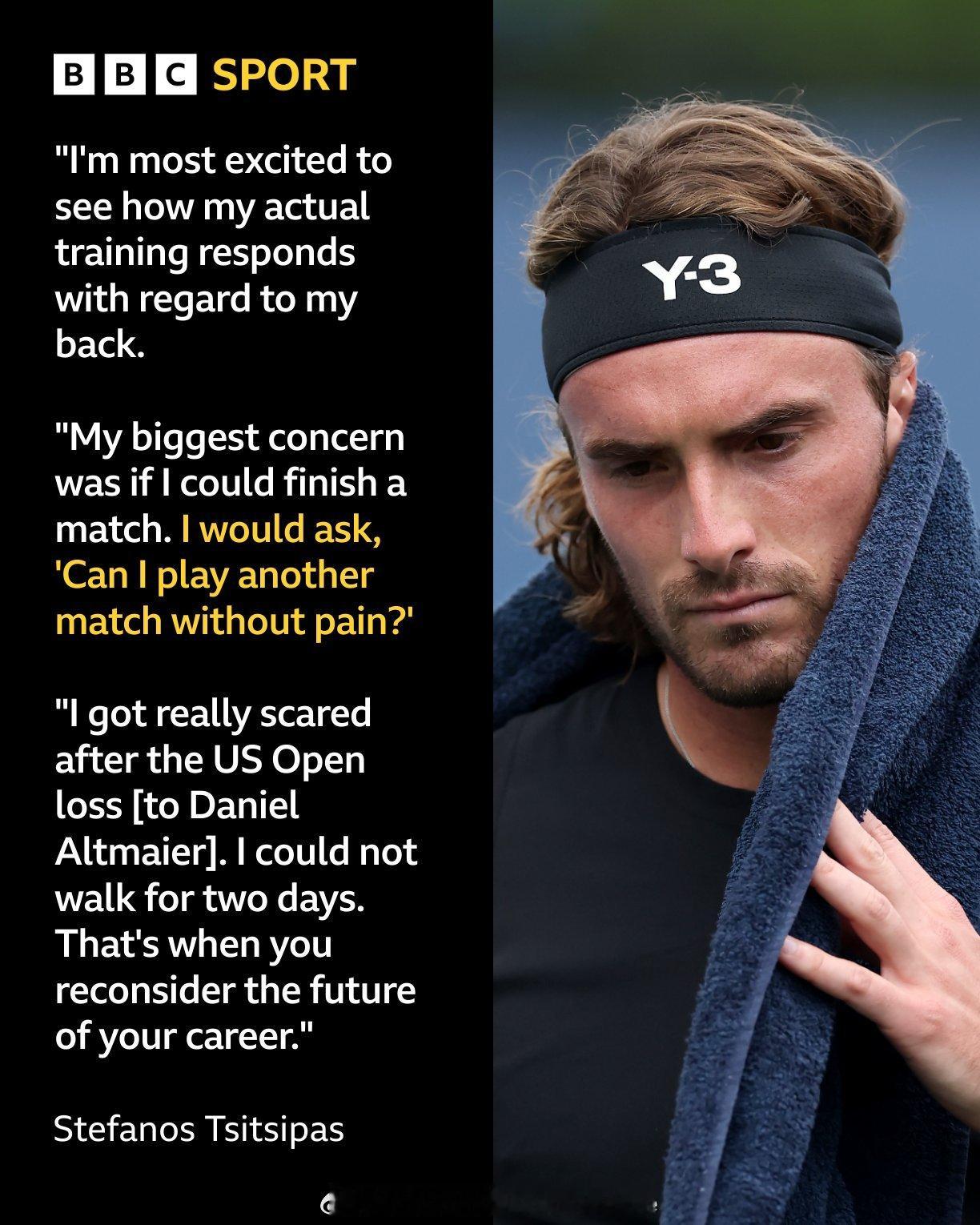 【西西帕斯2025因伤病考虑退役】“我最期待的是看看我的实际训练对我的背部状况会产生怎样的影响。”“我最担心的就是能否完成一场比赛。我会问自己:‘我能否在不感到疼痛的情况下再进行一场比赛?’”“在输给丹尼尔·阿尔特迈尔的美国网球公开赛失利之后,我感到非常害怕。我整整两天都走不了路。那时候你就得重新思考自己职业生涯的未来了。”