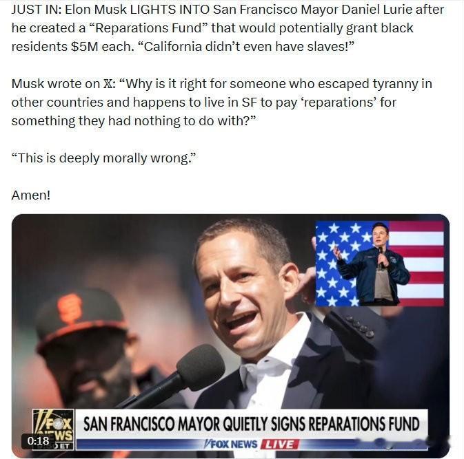 埃隆·马斯克猛烈抨击旧金山市长丹尼尔·卢里,因为他设立了一个“赔偿基金”,可能会向黑人居民每人发放500万美元。马斯克指出:“加州根本没有过奴隶制!” 马斯克在𝕏 上写道:“为什么那些逃离其他国家暴政、碰巧住在旧金山的人,要为他们根本没有参与过的事情支付‘赔偿’?” “这是极其错误的道德行为。”