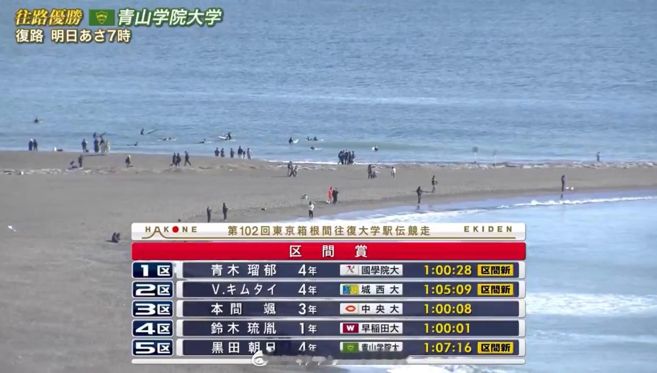 第102届箱根驿传 第一区,国学院大学青木瑠郁1:00.28拿到区间赏。目前进行