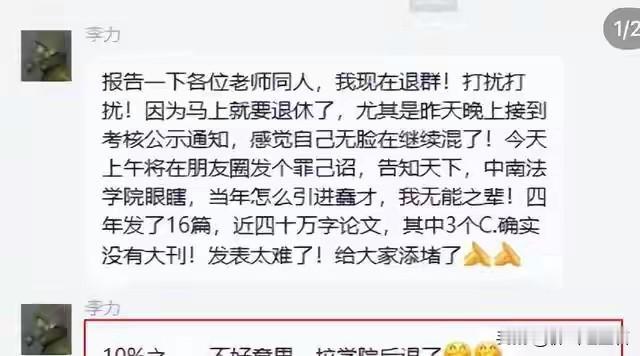 3月11日,“中南财经政法大学教授考核不过当场退群发‘罪己诏’”的事儿在网上闹得沸沸扬扬。ID为“李力”的教授称因马上退休,接到考核公示通知后自觉无脸再待,还吐槽中南法学院当年引进自己是“眼瞎”。他四年发了16篇近四十万字论文,3个C刊,只是缺大刊。 “阿力2”(疑为李力另一ID)朋友圈的“罪己诏”也很扎心,他四年教学考核合格还有一年优秀,合起来却不合格,而学校要求10%不合格,他成了唯一不合格的二级教授。截至目前,学校官网还没公布具体原因和处理措施,这事儿后续走向值得关注。