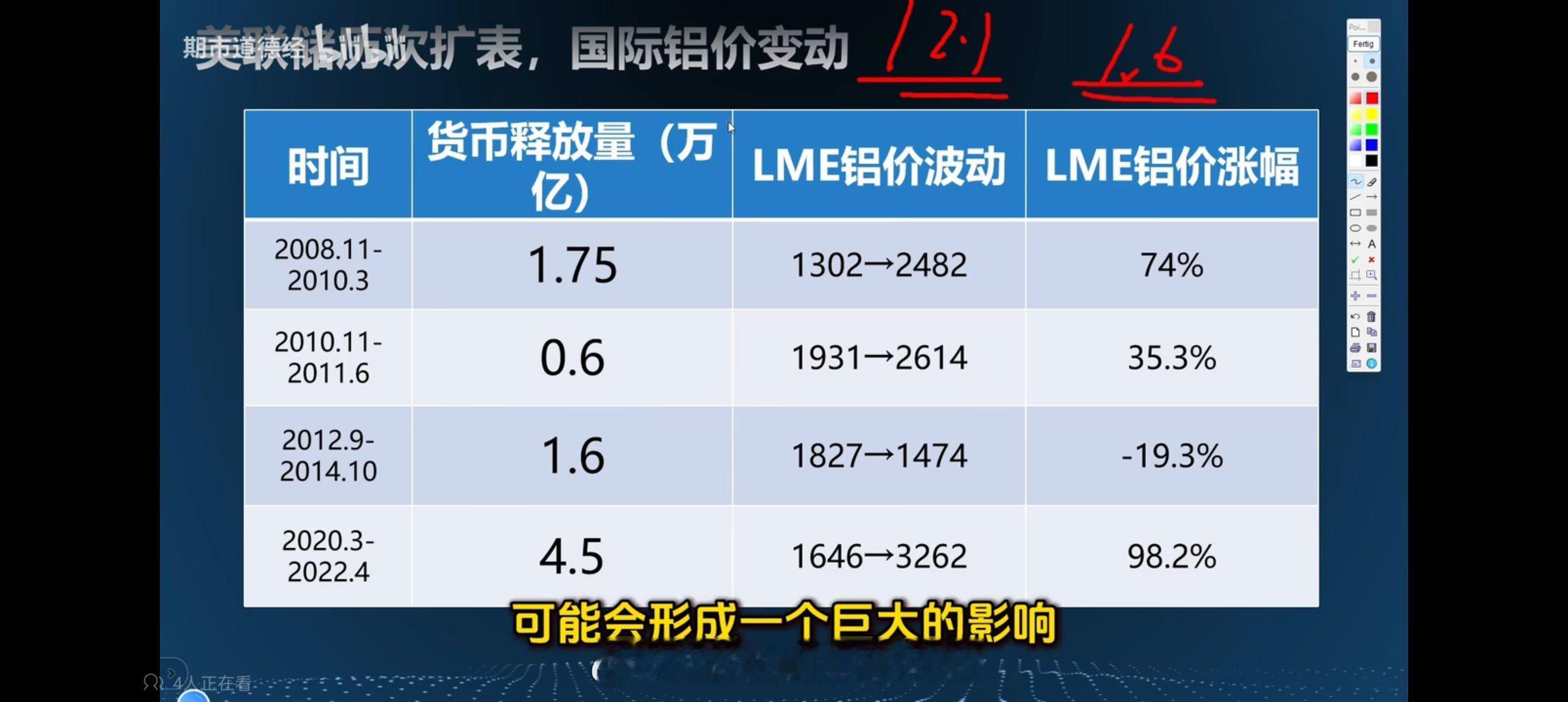 美联储历次扩表,与伦敦电解铝 价格涨幅统计。