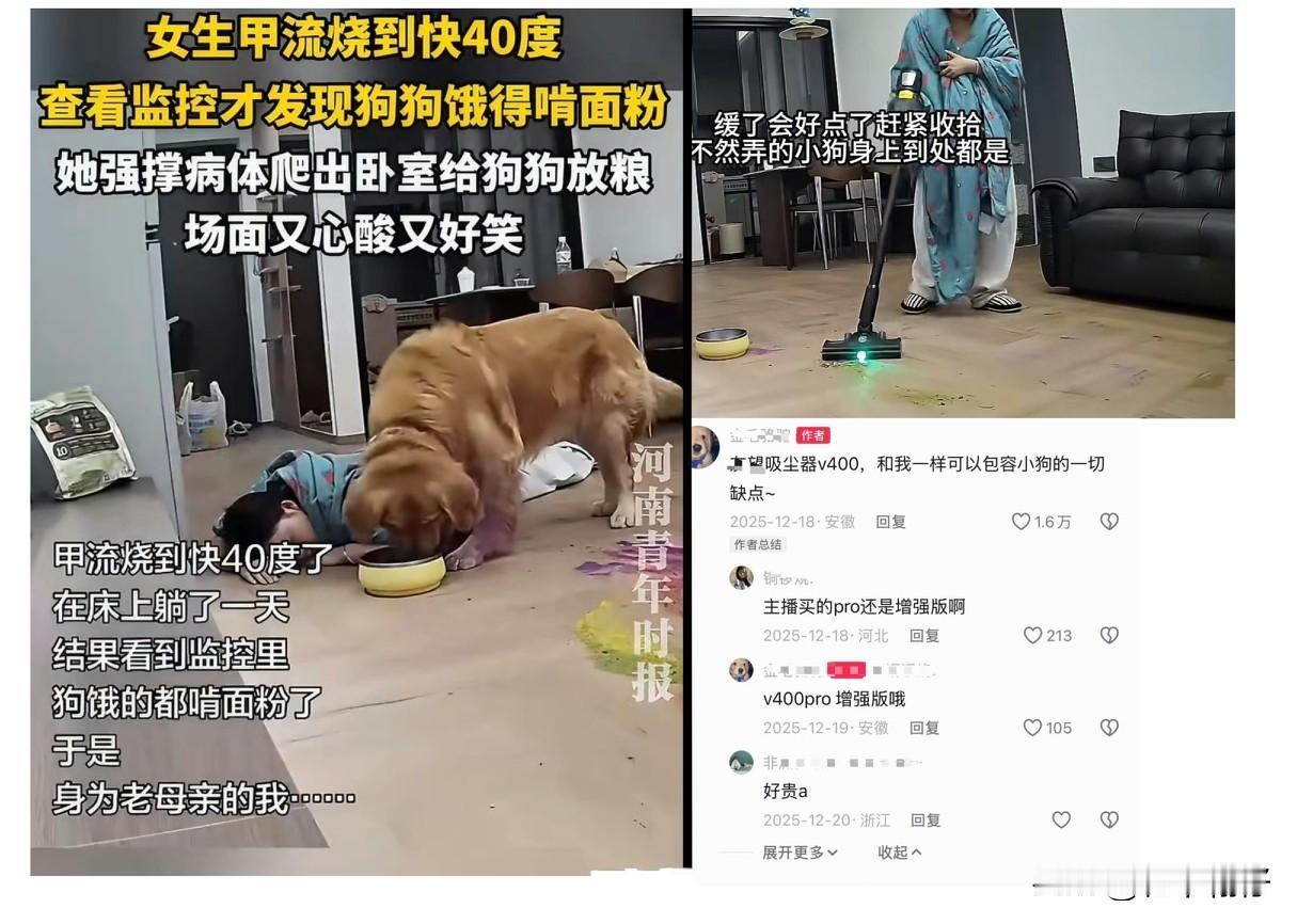 河南一位女生因甲流高烧近40℃无法起身,通过家中监控发现狗狗饿到啃食面粉袋,强撑身体爬出卧室为狗添粮的画面引发热议,现场既狼狈又温情。 真的又好笑又心疼!烧到迷糊起不来床,家里狗狗饿到只能扒拉面粉啃,这画面感一下就出来了,狗狗委屈巴巴的样子谁看了不心软啊! 视频后面用吸尘器打扫卫生,然后评论区带货,这感觉像摆拍呀,互联网果然不能感性。 即便事件经过某种程度的编排,它之所以能引发广泛共鸣,根本上是因为它触碰了真实的社会情感结构。它映射了都市中大量“宠物独生子女家庭”的普遍焦虑——“我若倒下,毛孩子怎么办?” 这种由高强度工作、独居趋势与深厚情感寄托共同催生的不安,是千真万确的。