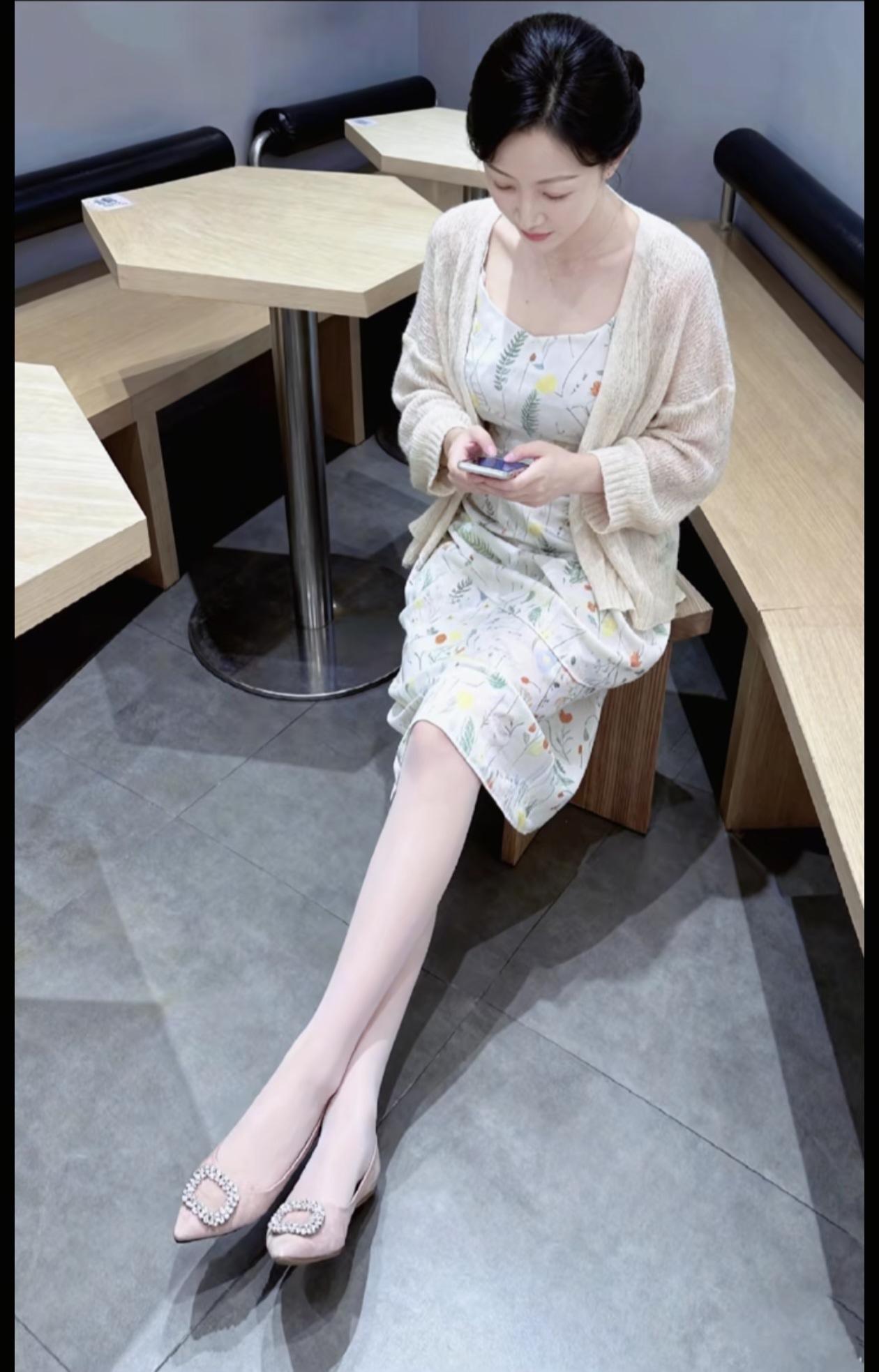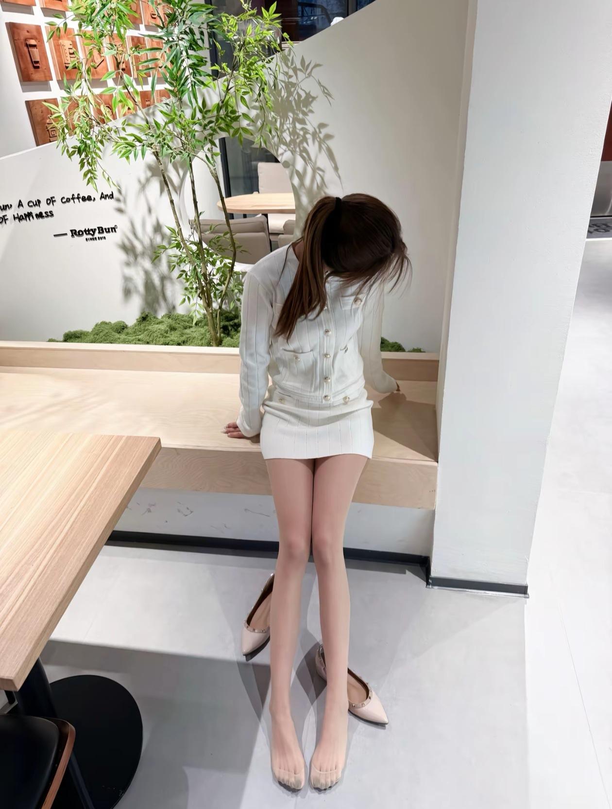 白色针织套装,搭配粉色平底鞋,清新自然,简约而不失优雅。