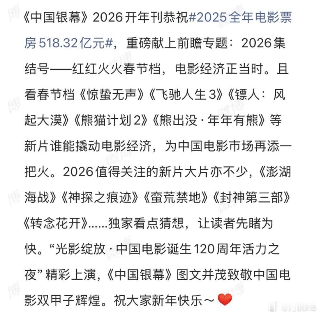 中国银幕:2026春节档《惊蛰无声》《飞驰人生3》《镖人:风起大漠》《熊猫计划2》《熊出没•年年有熊》等新片