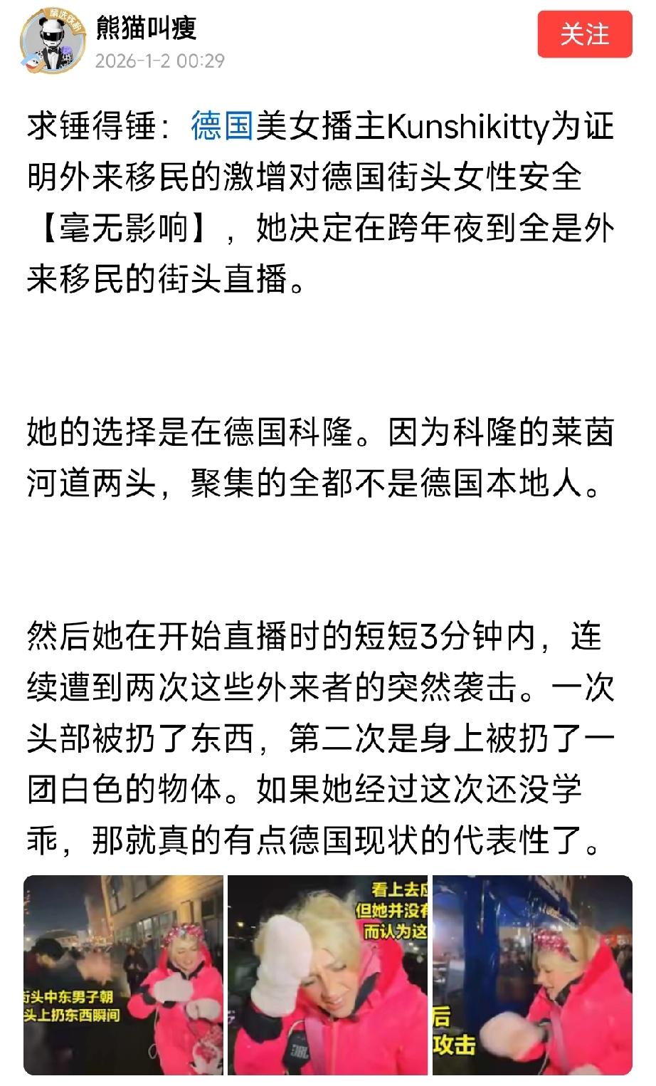 这个女主持人应该也算是欧洲精英了,料想应该也是一个精美者。估计她这是想要用自身行动来验证奥巴马、拜登的"多元"化是对的,当今的特朗普是错的。结果却是撞上了迎面飞来臭鸡蛋。不过话又说回来,既然难民是北约国家创造出来的,接收难民自然是责无旁贷,否则就无法证明西方所谓自由世界的“光辉形象”。 说句不好听的,某种意义上来说,这何尝不是一种因果报应?在这方面,希望我国千万莫要跟风操作,盲目引进外来民。近段时间看到了不少关于外国人在景区游泳洗澡,高铁臭脚丫子乱伸等乱相。在这方面,我们没有制造难民,也没有接收难民的理由。