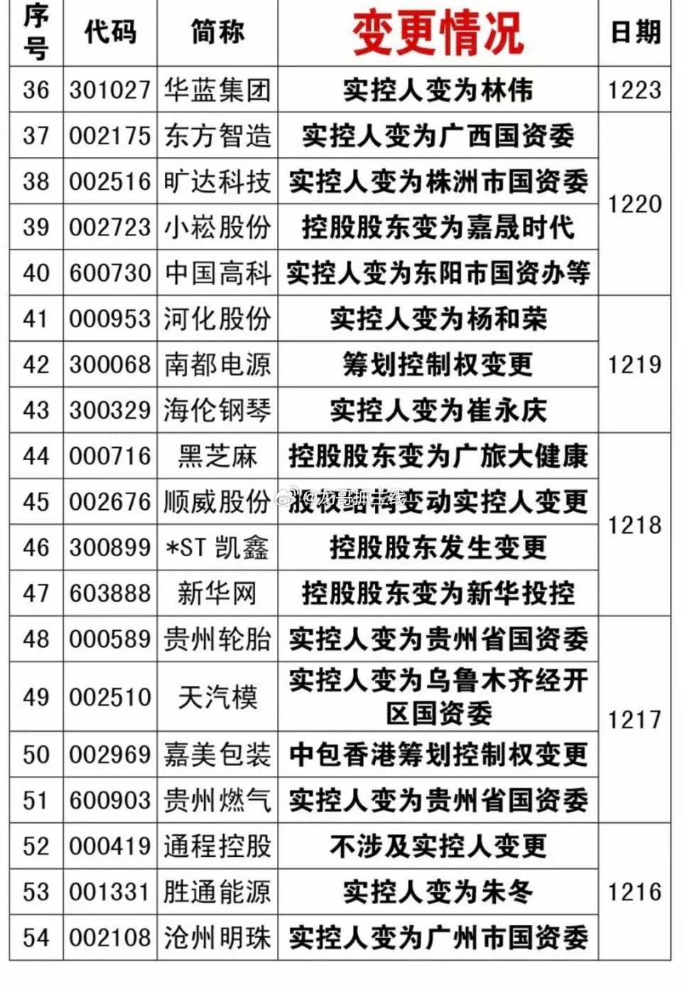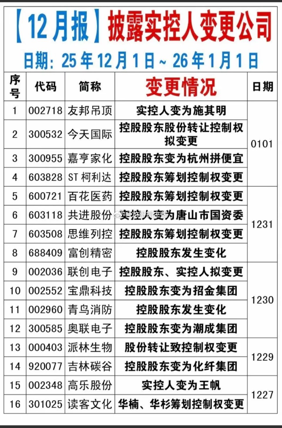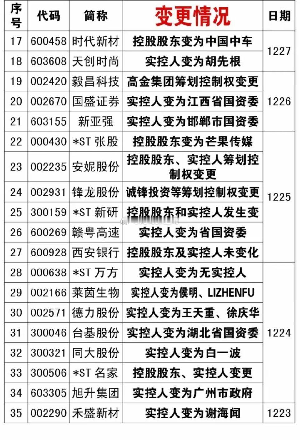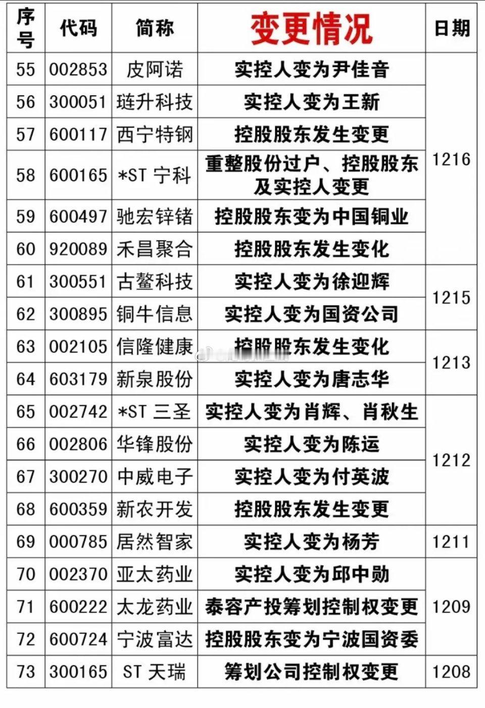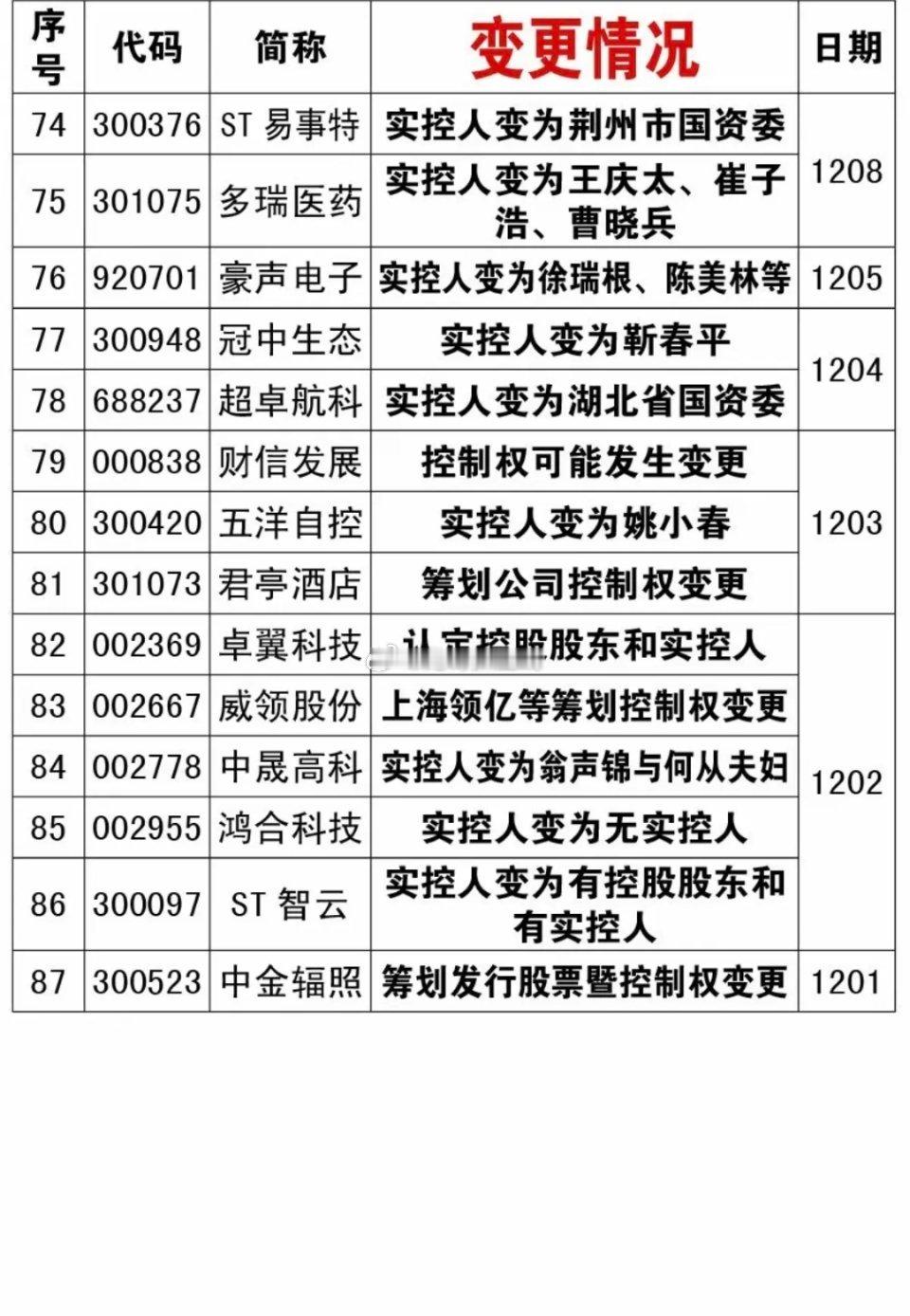 12月报:87家公司披露实控人变更!12月份累计有87家公司披露实控人变更,特别是部分实控人变更为国资控股的,绝对是大利好,有的低位股有拉升炒作机会。特别关注一些好题材股: