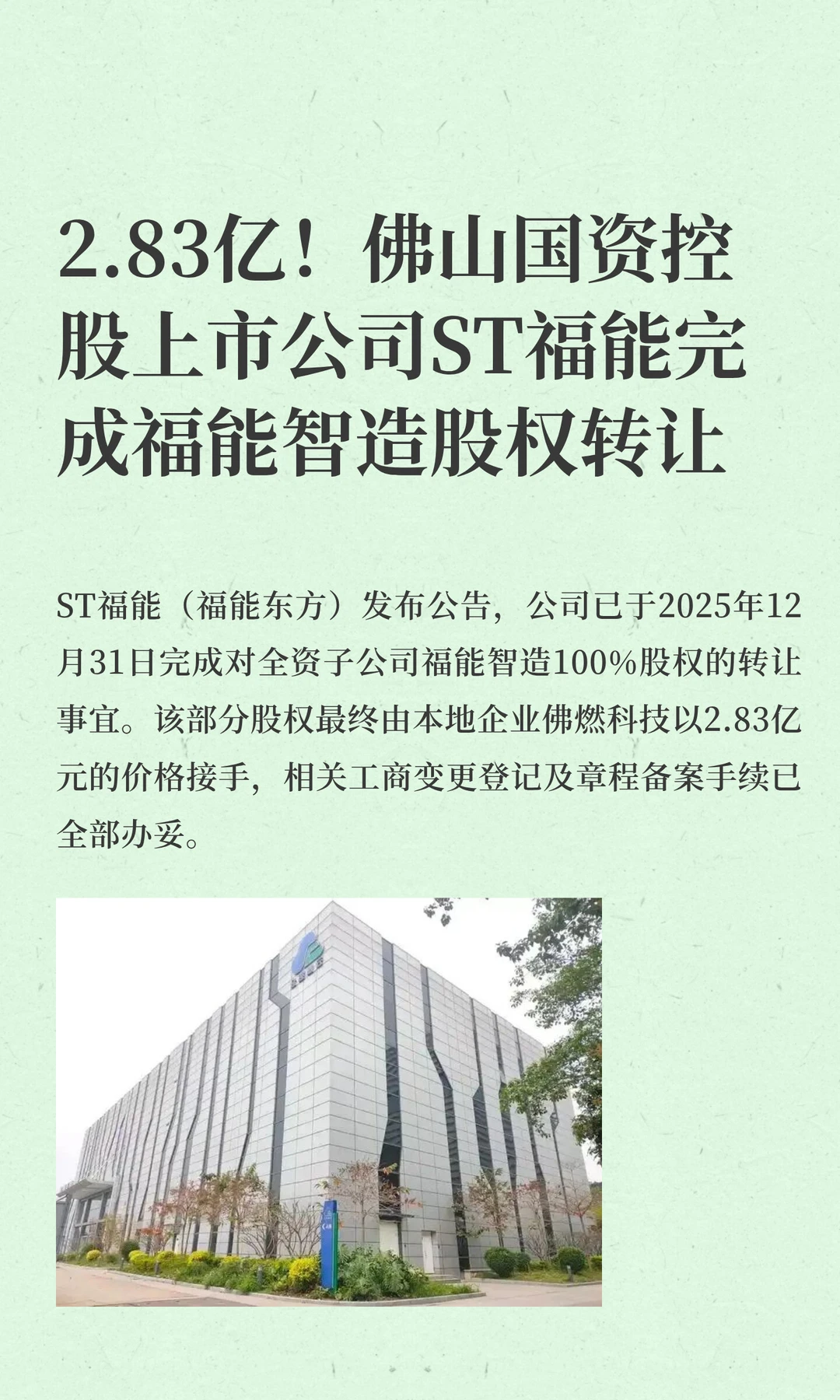 2.83亿!ST福能完成福能智造股权转让
