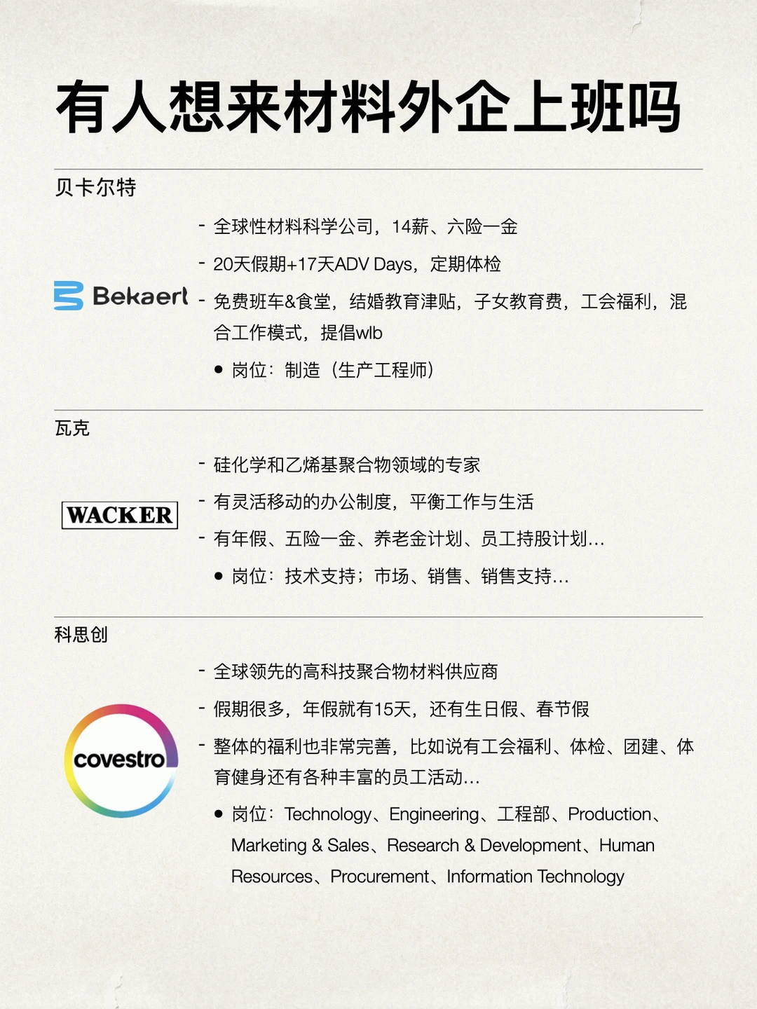 可能有很多人都觉得“材料”就以为是纯工厂、纯技术,其实完全不是。在国内招得更多的反而是市场、应用支持、项目协调、供应链、质量、采购...这些,机会还是蛮多的