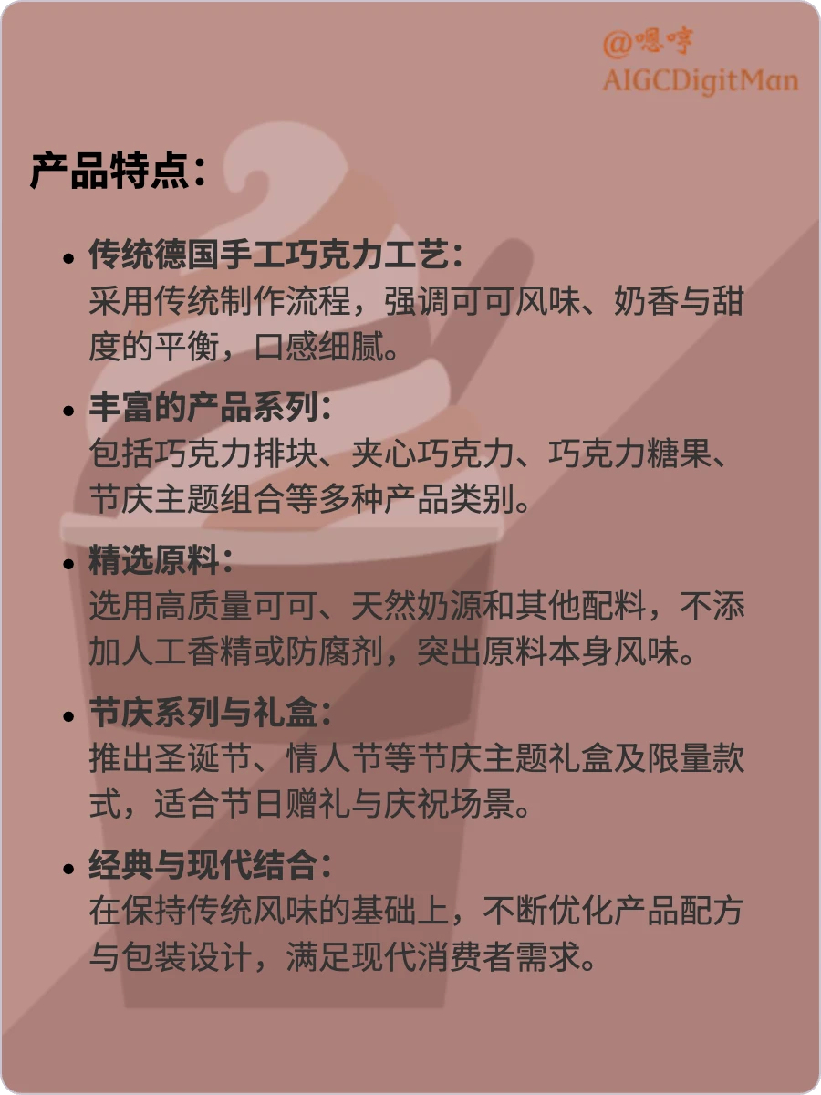 传统德国手工巧克力工艺: 采用传统制作流程,强调可可风味、奶香与甜度的平衡,口感细腻。