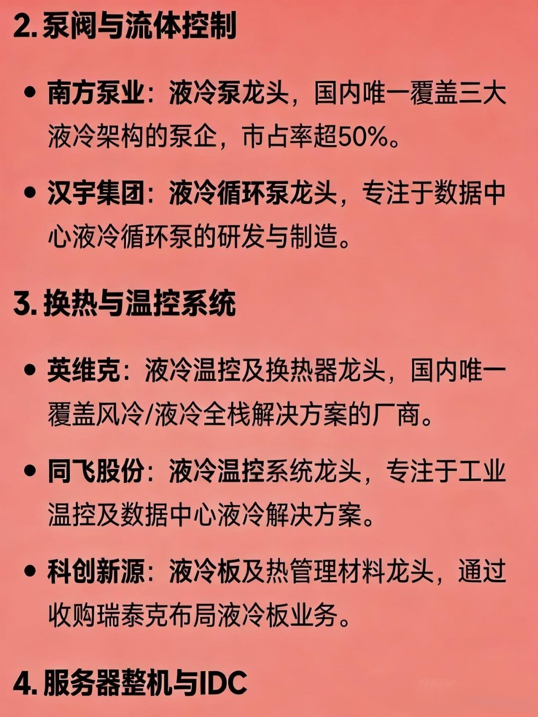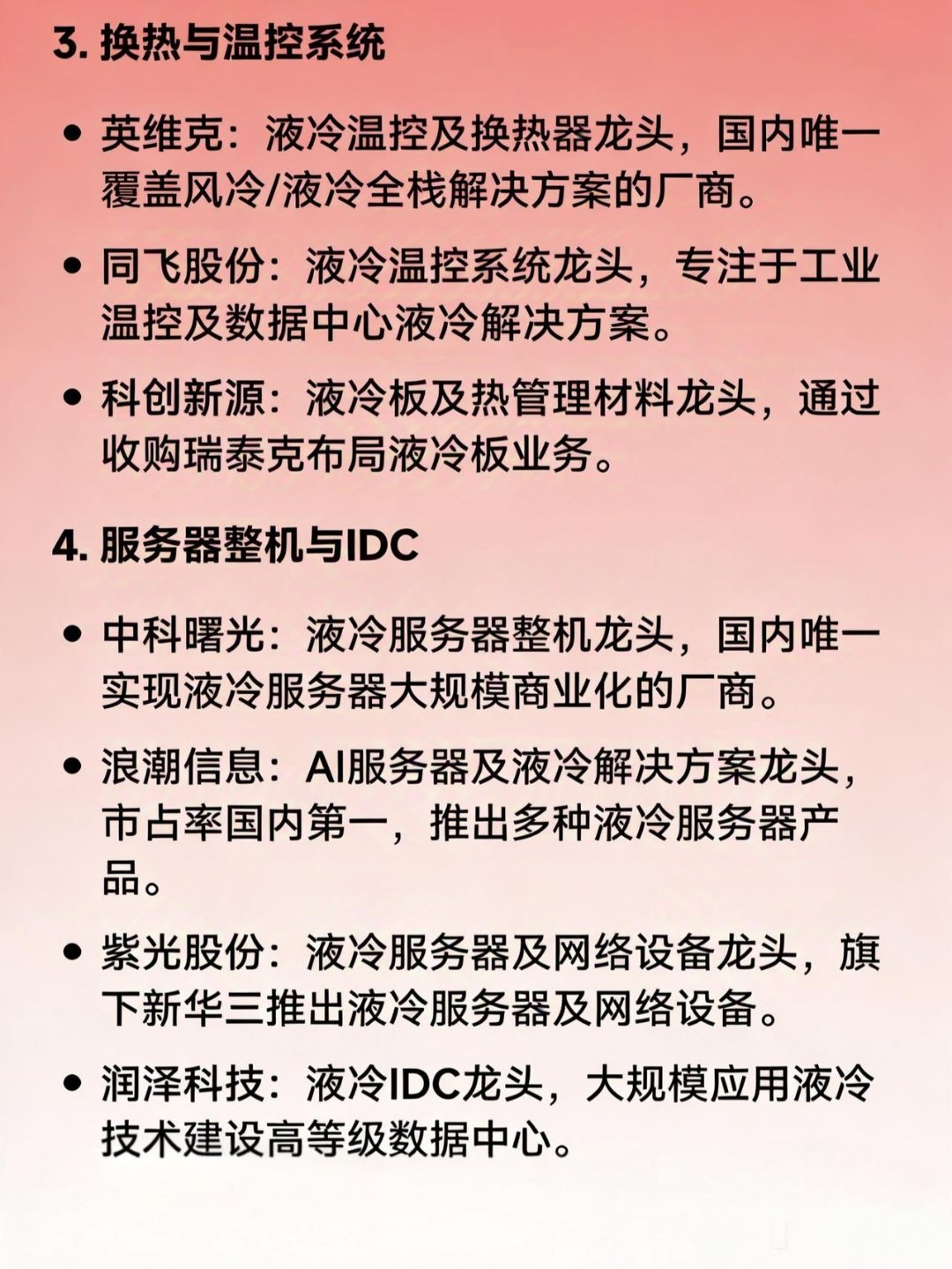 液冷服务器核心龙头汇总:1.核心组件与连接高澜股份:液冷散热及热管理龙头,国内首家上市公司,产品覆盖服务器、数据中心及储能温控。中石科技:液冷管路及散热组件龙头,提供数据中心全链条热管理解决方案。沃尔核材:液冷管路及绝缘组件龙头,产品包括液冷管路、绝缘端子等关键部件。飞荣达:液冷散热及电磁屏蔽龙头,提供液冷散热器、液冷管路等组件。2.泵阀与流体控制南方泵业:液冷泵龙头,国内唯一覆盖三大液冷架构的泵企,市占率超50%。汉宇集团:液冷循环泵龙头,专注于数据中心液冷循环泵的研发与制造。3.换热与温控系统英维克:液冷温控及换热器龙头,国内唯一覆盖风冷/液冷全栈解决方案的厂商。同飞股份:液冷温控系统龙头,专注于工业温控及数据中心液冷解决方案。科创新源:液冷板及热管理材料龙头,通过收购瑞泰克布局液冷板业务。4.服务器整机与IDC中科曙光:液冷服务器整机龙头,国内唯一实现液冷服务器大规模商业化的厂商。浪潮信息:AI服务器及液冷解决方案龙头,市占率国内第一,推出多种液冷服务器产品。紫光股份:液冷服务器及网络设备龙头,旗下新华三推出液冷服务器及网络设备。润泽科技:液冷IDC龙头,大规模应用液冷技术建设高等级数据中心。