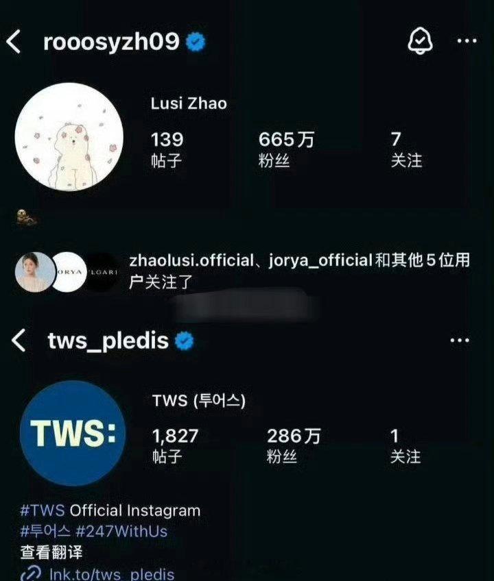 赵露思的ins粉丝数比韩团TWS还多,赵露思是665万,TWS是286W。