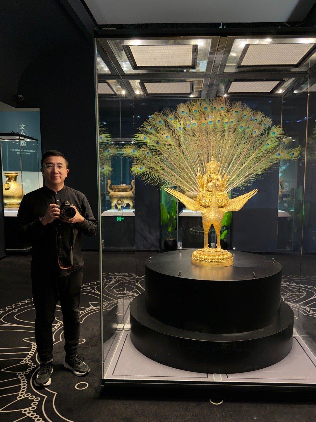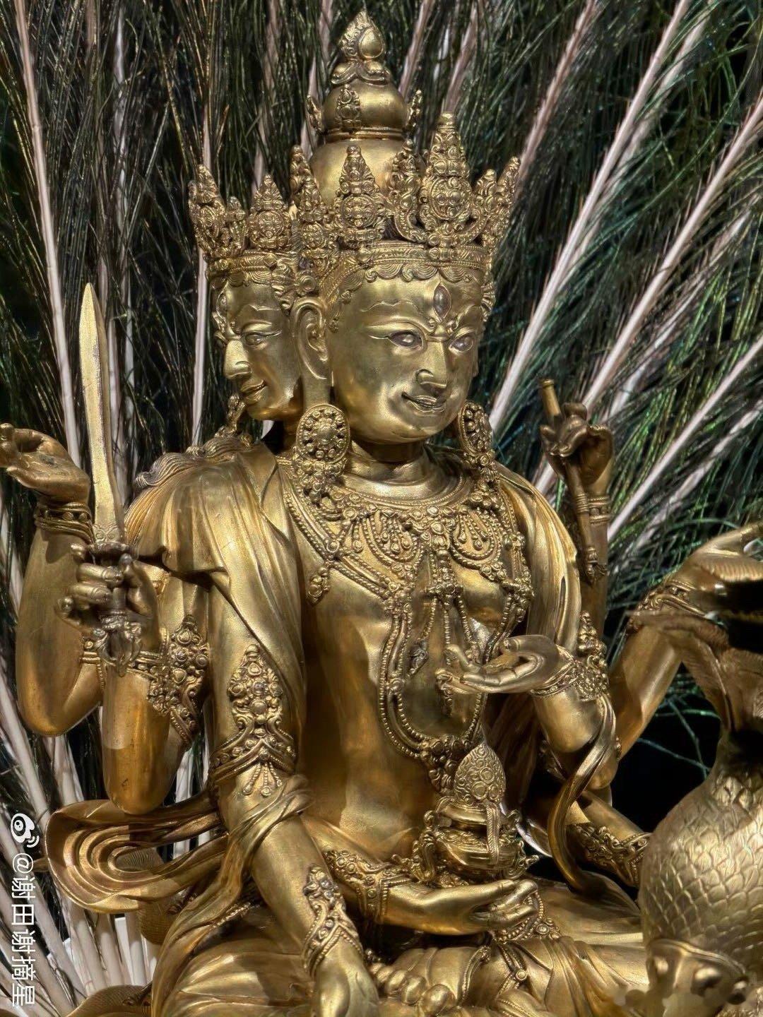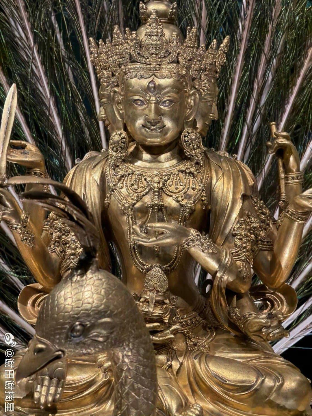 2026新年新见第一宝物:明宣德铜鎏金孔雀明王像。柏林民族学博物馆藏,上海博物馆“烁古融新”特展展出。这尊密教的孔雀明王像于1912年由古董商人购于北京,有“大明宣德年施”的款,毫无疑问是皇家之物,它高145厘米,重89公斤,是明代皇家密宗造像的极品之一。原来的造像可能有金属的尾羽,因为后面没有插尾羽的地方,德国人弄了真的孔雀羽毛做装饰,入境的时候不能带进来,所以上博用国产羽毛做了替代。宝物亲见,合影留念谢田看宝