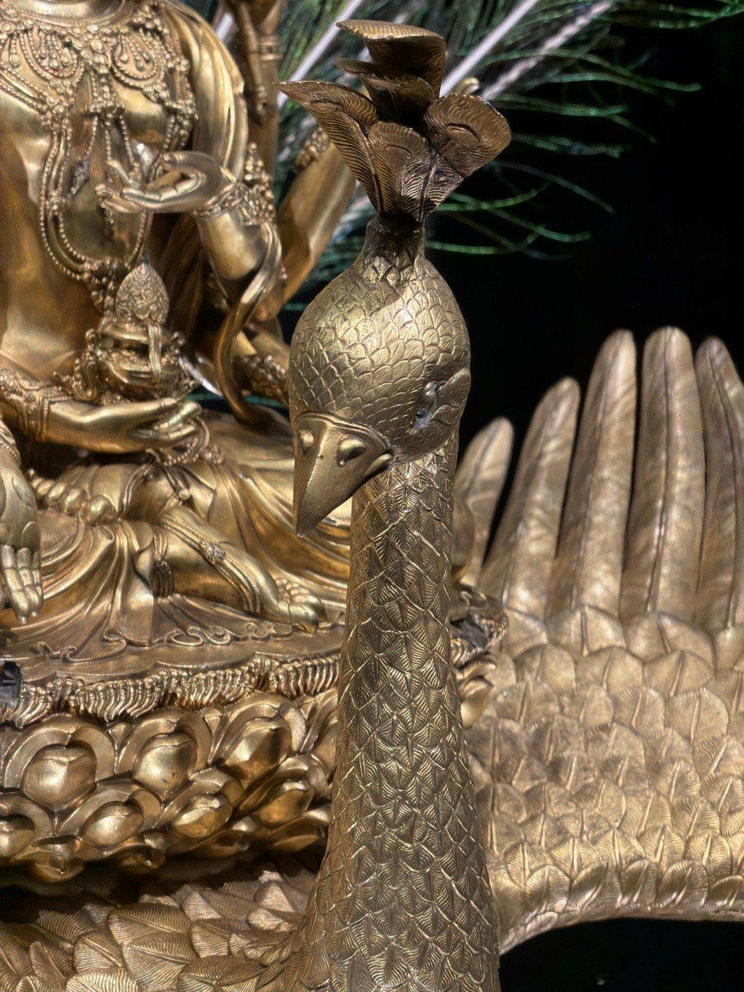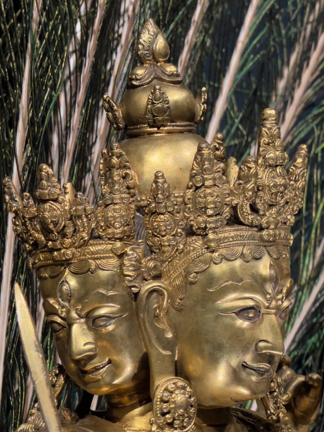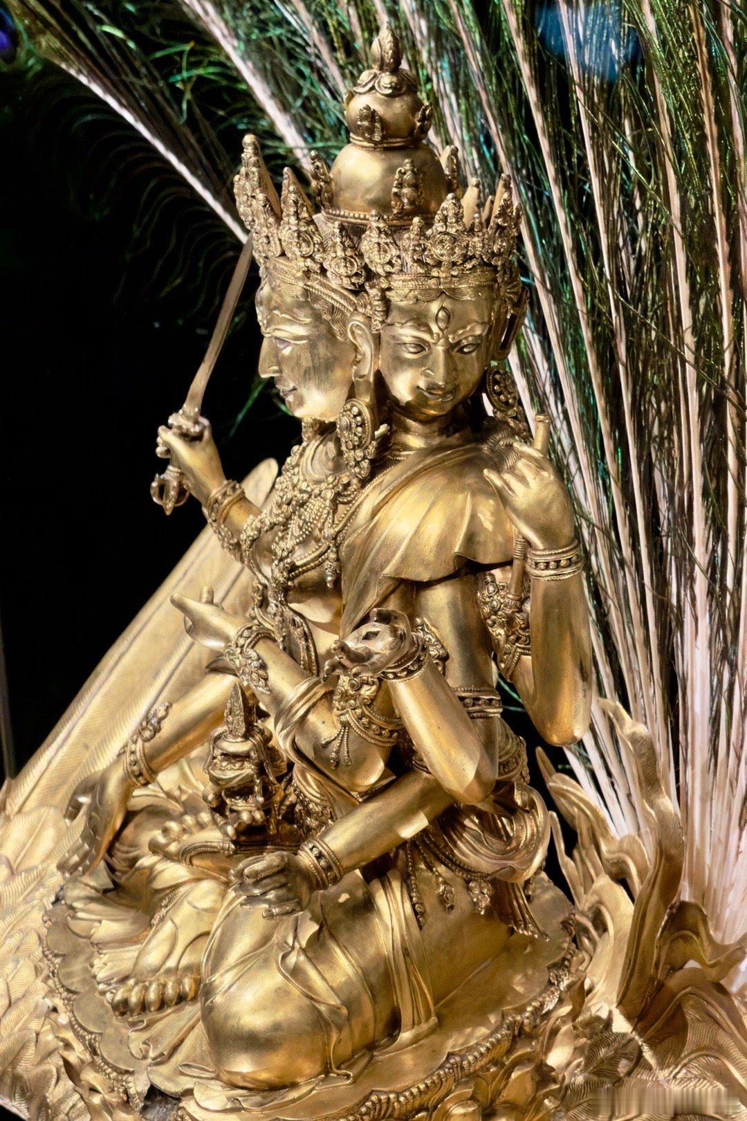 2026新年新见第一宝物:明宣德铜鎏金孔雀明王像。柏林民族学博物馆藏,上海博物馆“烁古融新”特展展出。这尊密教的孔雀明王像于1912年由古董商人购于北京,有“大明宣德年施”的款,毫无疑问是皇家之物,它高145厘米,重89公斤,是明代皇家密宗造像的极品之一。原来的造像可能有金属的尾羽,因为后面没有插尾羽的地方,德国人弄了真的孔雀羽毛做装饰,入境的时候不能带进来,所以上博用国产羽毛做了替代。宝物亲见,合影留念谢田看宝