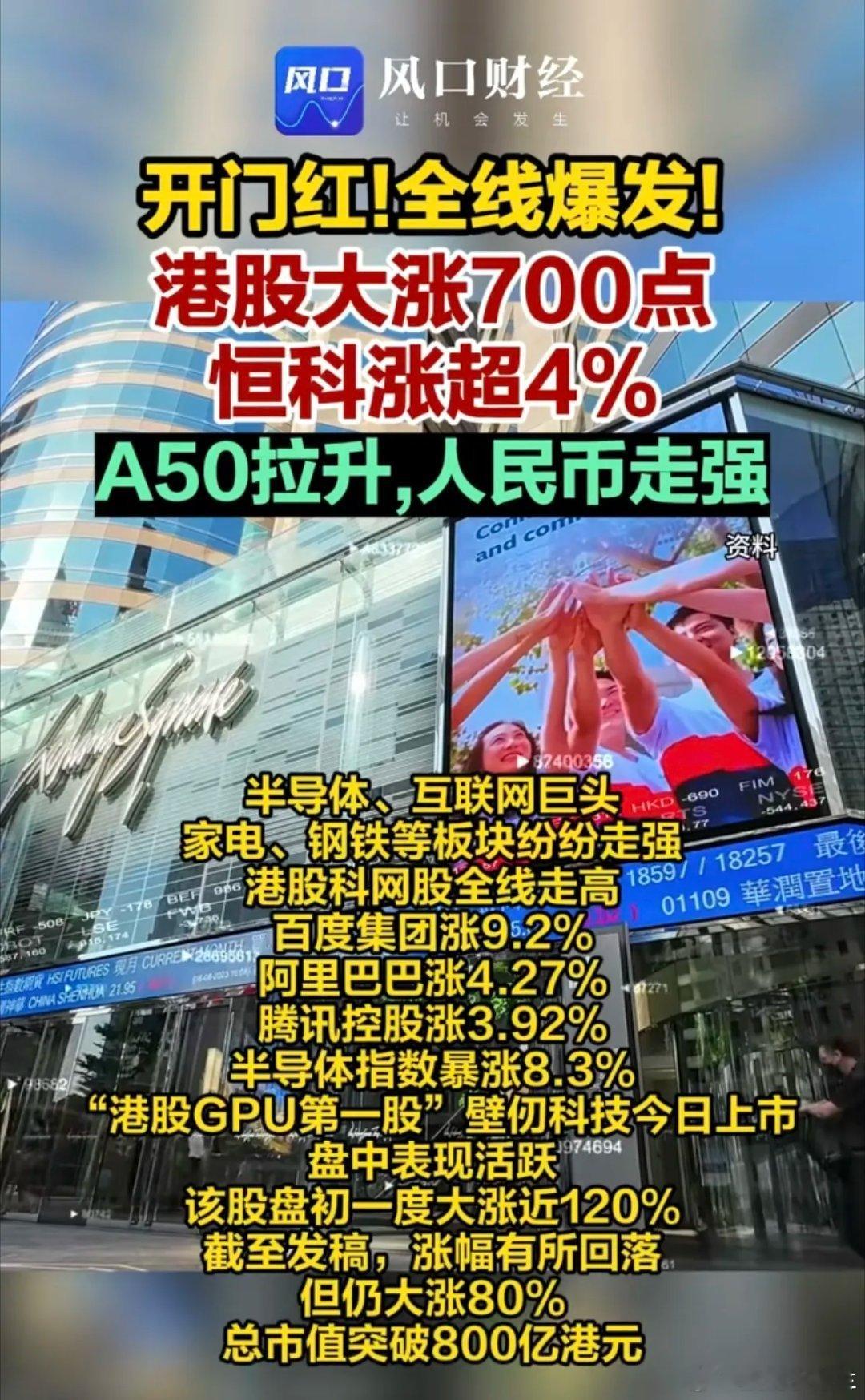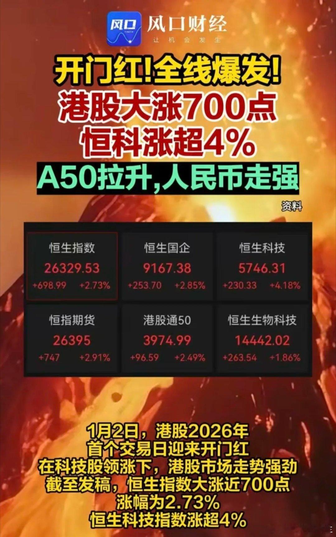 2026年港股开门第一天:大涨,开门红!港股大涨超700点。恒生icon科技涨超4%A50拉升,人民币走强