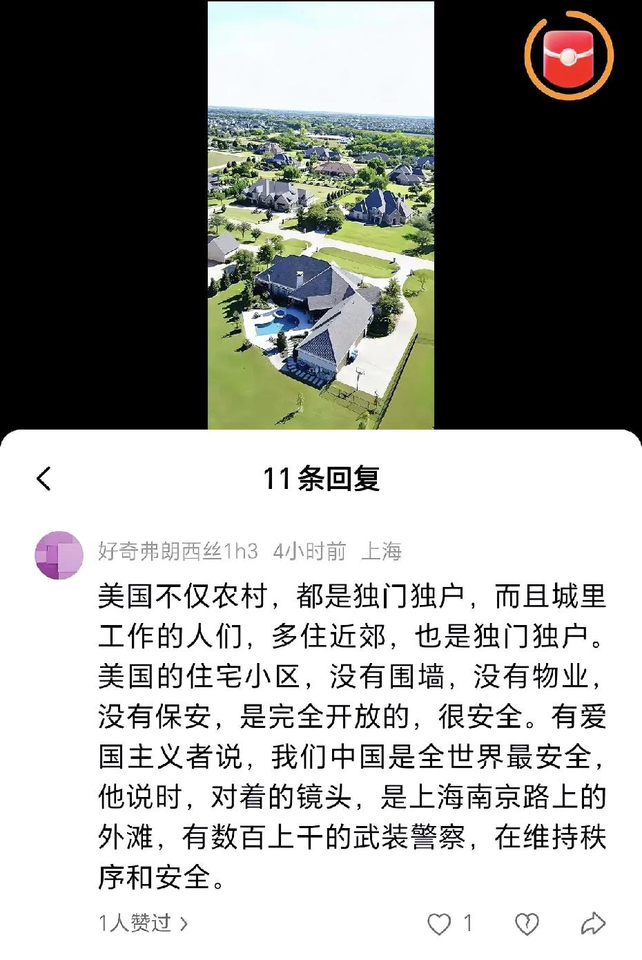 这个网友IP显示是上海,但大概率应该是个中国台湾省的网友。而且是一个不太合格的知通电军。 首先,视频里提到的美国农村,确实,很多都是独门独院的,但可没有这么漂亮的房子,视频里的是美国的富人区。 其次,美国真的那么安全的话,为什么每年都有四五万人死在枪击之下? 最后,我们上海不是每天都有好几百个武警在街上,是人特别多的时候,才会在那里维持秩序,而且是不带枪的。 作为一个网军,这个中国台湾省的网友,确实有失水准。 台湾省媒体