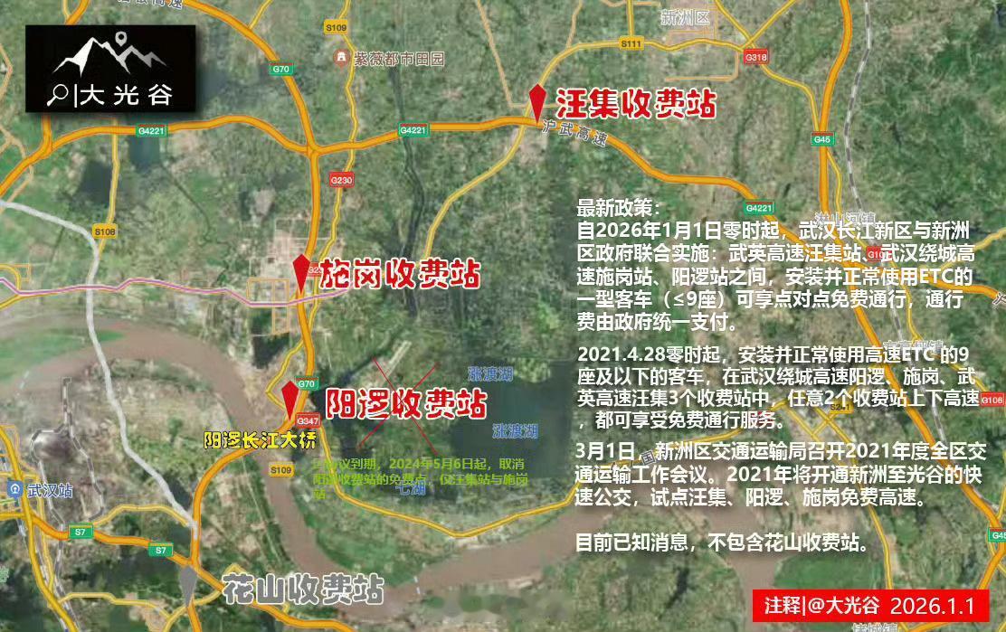 汪集、施岗、阳逻三个高速收费站之间再免费通行! 近日获悉,自2026年1月1日零时起,武汉长江新区与新洲区政府联合实施:武英高速汪集站、武汉绕城高速施岗站、阳逻站之间,安装并正常使用ETC的一型客车(≤9座)可享点对点免费通行,通行费由政府统一支付。